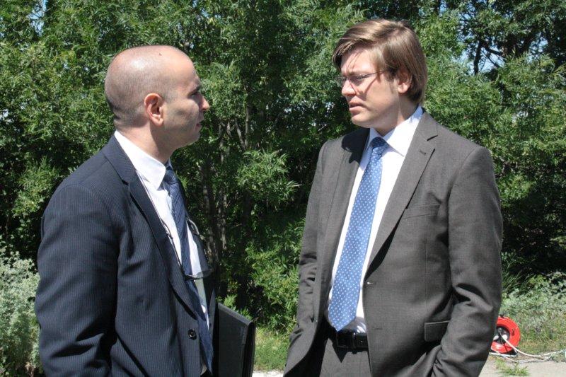 Yurii Tokarski (r), co-facilitator of the Ukrainian OSCE Chairmanship, speaking with Kakhaber Kemoklidze, Georgian leading participant, at a meeting of the Incident Prevention and Response Mechanism, Ergneti, 21 June 2013.