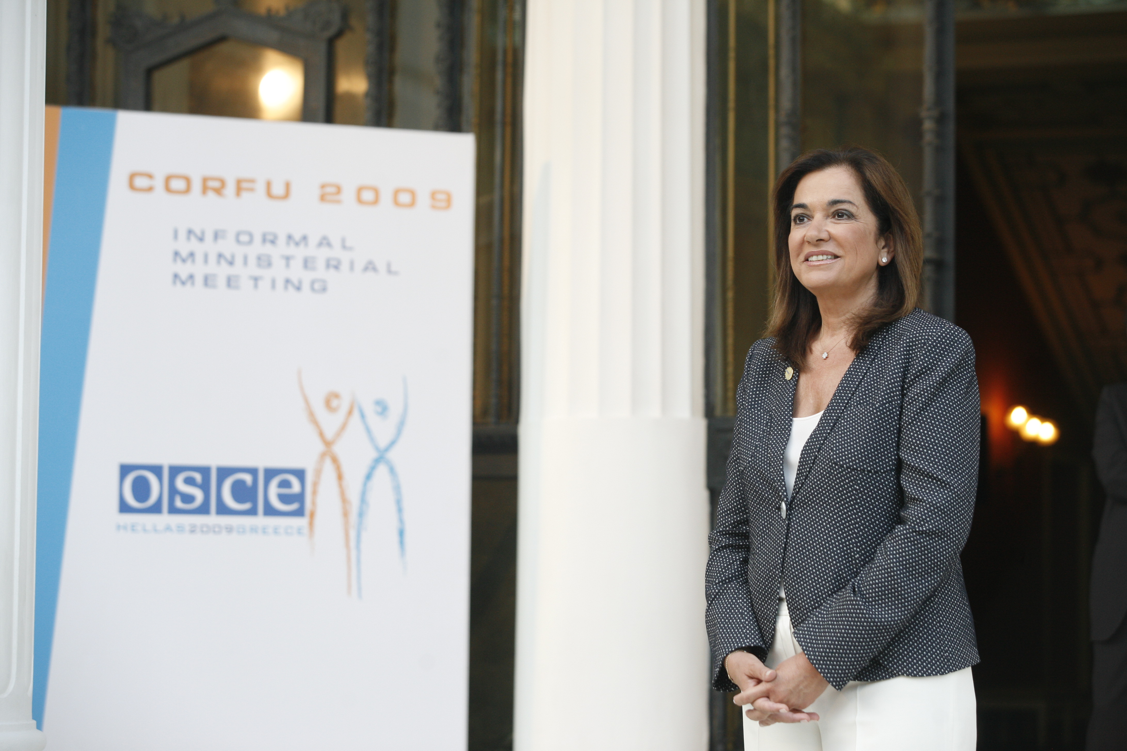 OSCE Chairperson-in-Office and Greek Foreign Minister Dora Bakoyannis waits to greet the foreign ministers as they arrive at the Achillion Palace in Corfu, 27 June 2009.