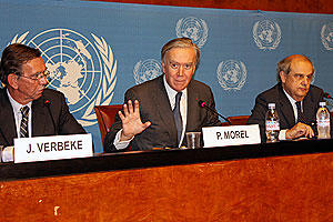 Ambassador Johan Verbeke of the UN (left), Ambassador Pierre Morel of the EU and Ambassador Charalampos Christopoulos of the OSCE at a news conference in Geneva on 17 September 2009.