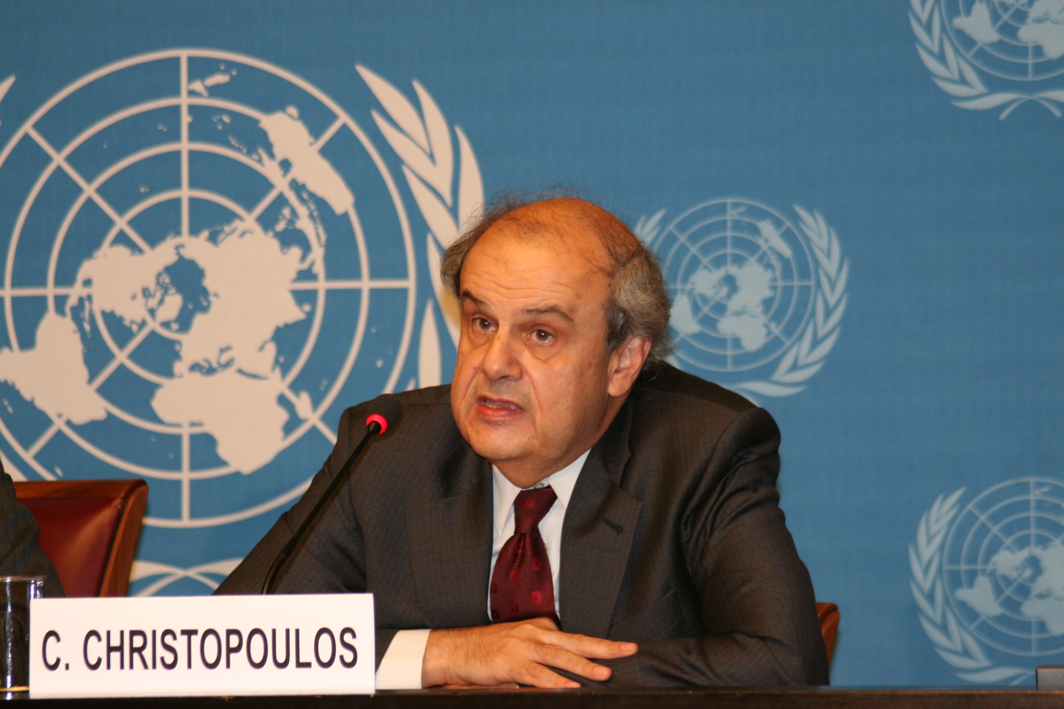 Ambassador Charalampos Christopoulos, Special Representative of the OSCE Chairperson-in-Office, speaks to the media following the eighth round of Geneva discussions, 11 November 2009.