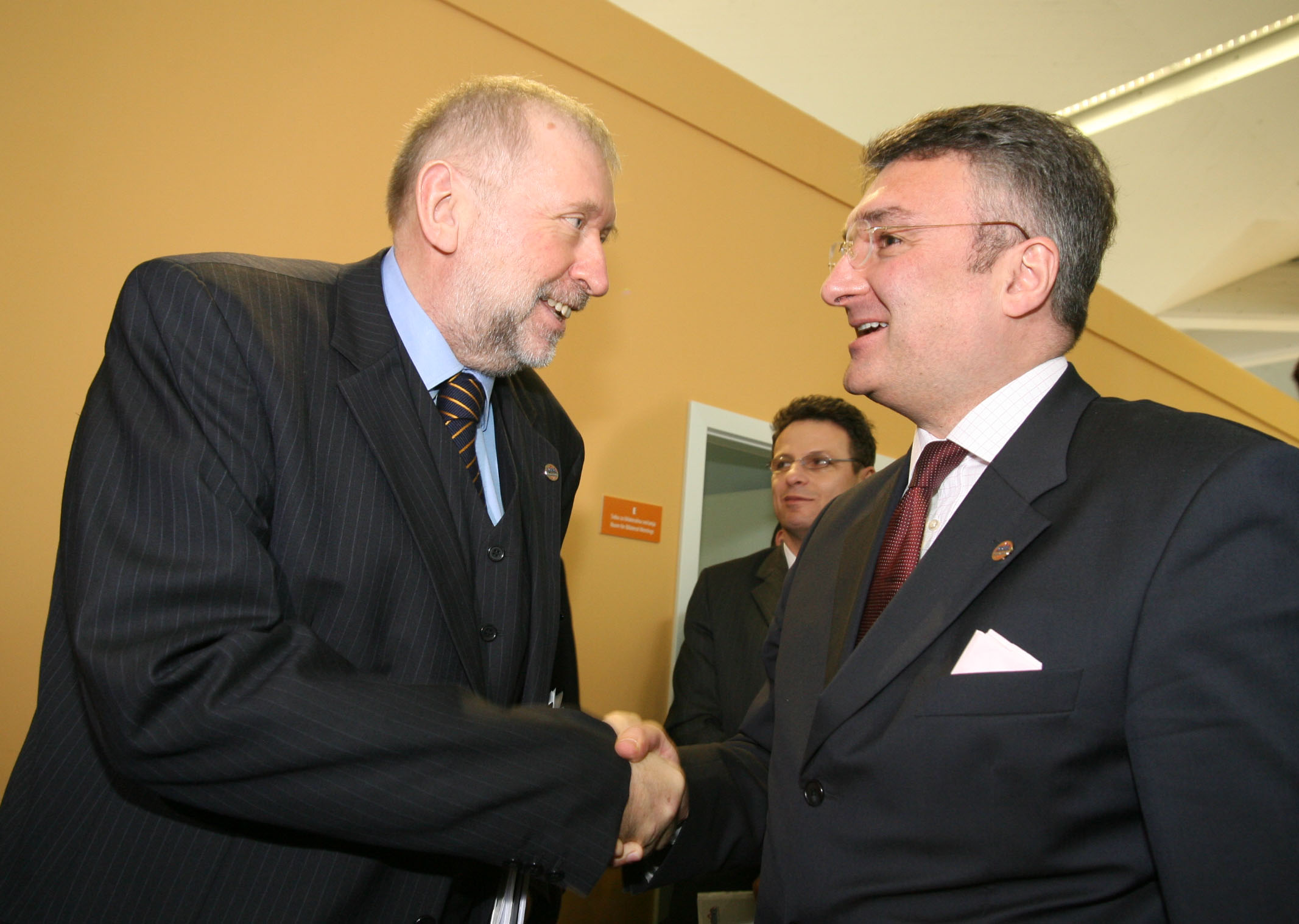 The Foreign Minister of the Republic of Montenegro, Miodrag Vlahovic (right), meets OSCE Chairman-in-Office Dimitrij Rupel at the 13th OSCE Ministerial Council in Ljubljana, 6 December 2005.