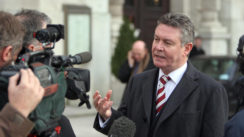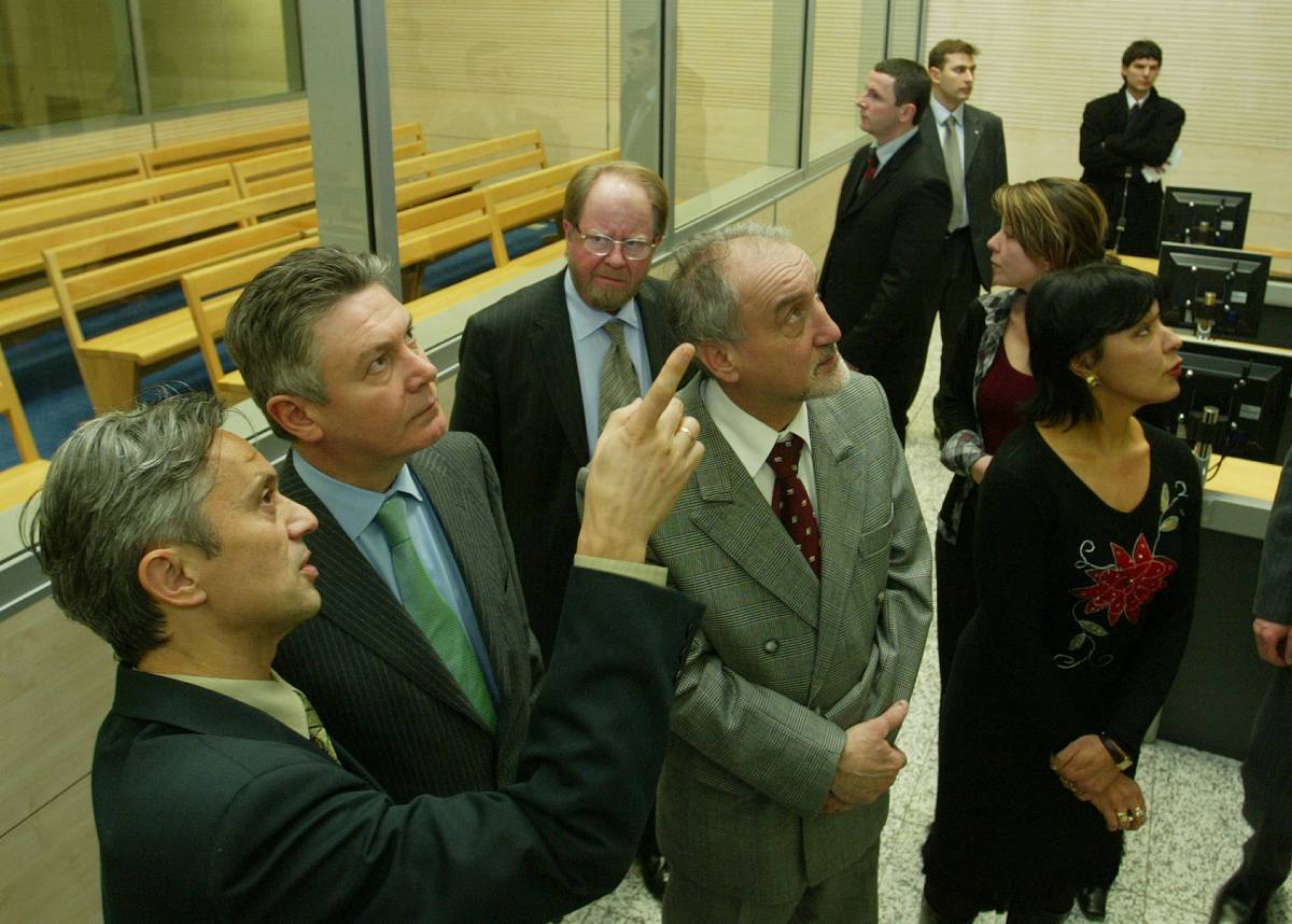 From left to right: Sinisa Vazic, President of the Belgrade District Court's War Crimes Chamber, briefs OSCE Chairman Karel De Gucht and Mission Head Hans Ola Urstad, with War Crimes Prosecutor Vladimir Vukcevic, 17 February 2006.