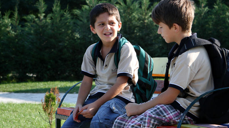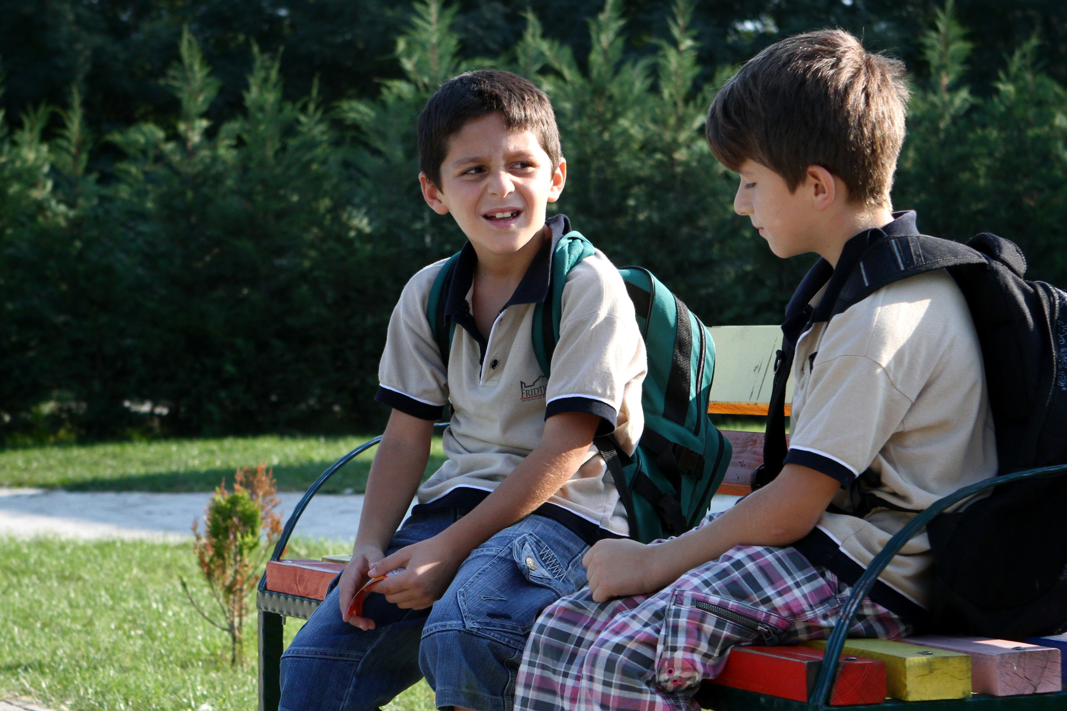 Two primary schoolchildren outside the Fridtjof Nansen Integrated Bilingual Primary School, Preljubiste, 5 October 2011.