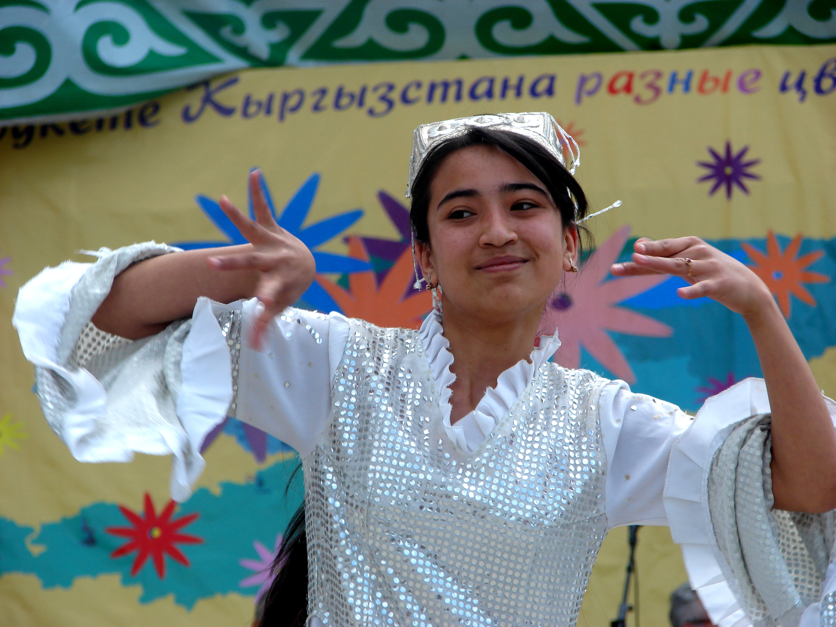 A girl performs a traditional dance at 'The Colours of Friendship' drawing competition award ceremony, Osh, Kyrgyzstan, 1 June 2008.