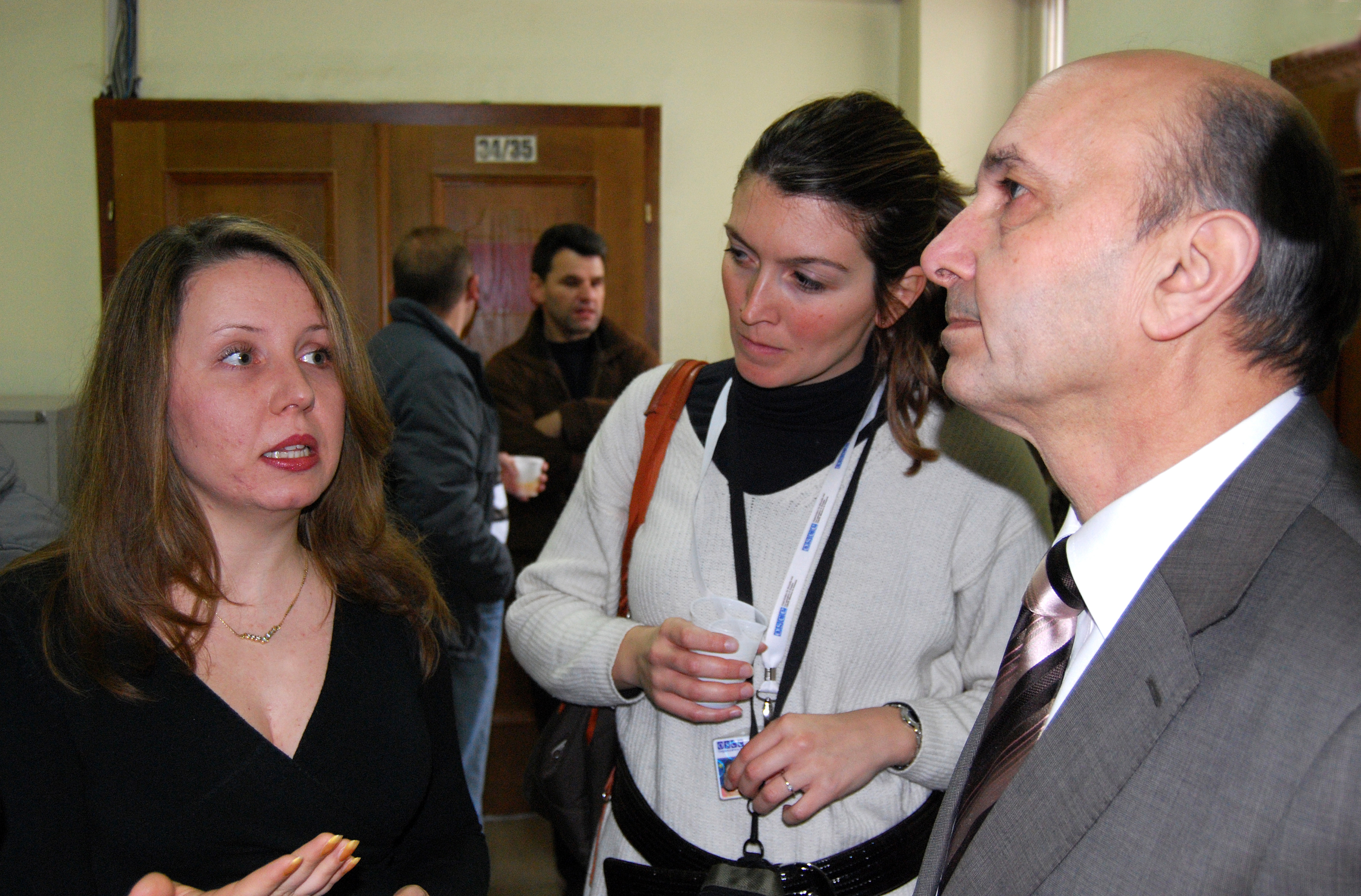 Ida Manton (l) and Chiara Lorenzini (c) of the OSCE municipal team for Prishtine/Prstina, speak to the city's Mayor, Isa Mustafa, at the inauguration of the Mission in Kosovo-supported municipal legal libraries, Prishtine/Prstina, 27 January 2009.