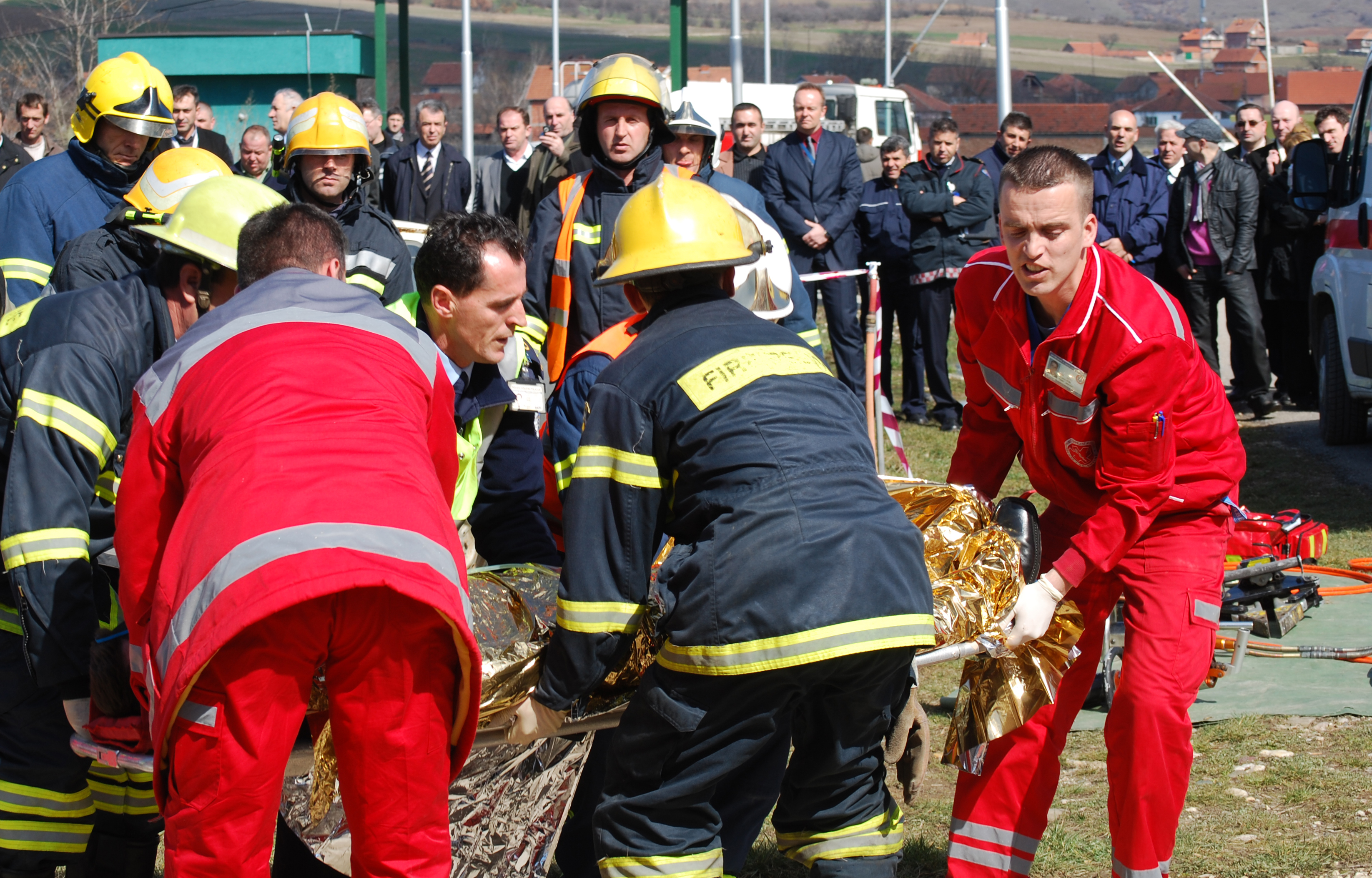 The Kosovo Police Service and Fire Rescue Service simulate a traffic accident after the handover of OSCE-donated first aid bags to the Fire and Rescue Station in Vushtrri/Vucitrn, 9 March 2009.