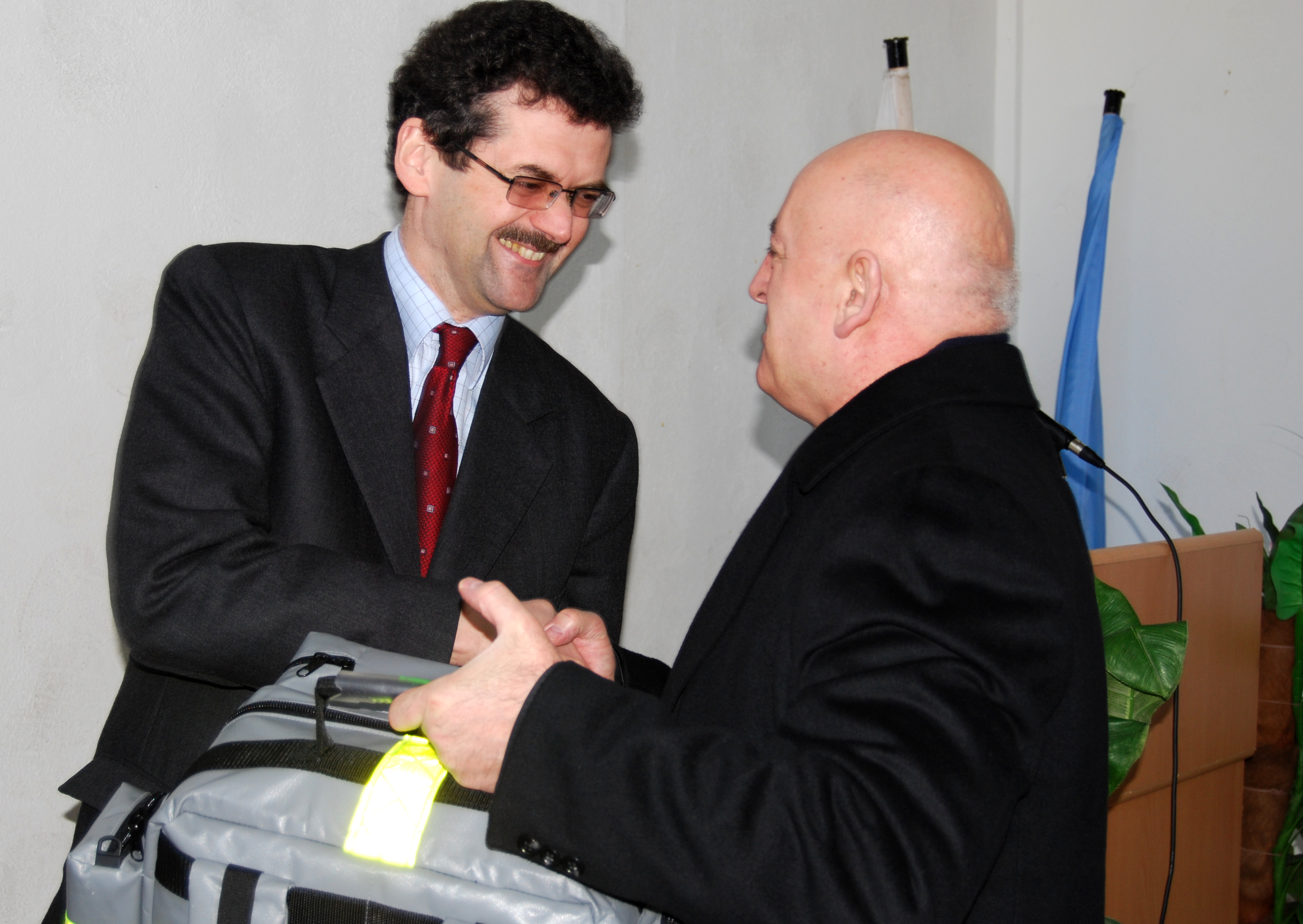 Ambassador Werner Almhofer (l), Head of the OSCE Mission in Kosovo, hands over OSCE-donated first aid bags to the Director of Kosovo Police Service, Sheremet Ahmeti, Vushtrri/Vucitrn 9 March 2009.