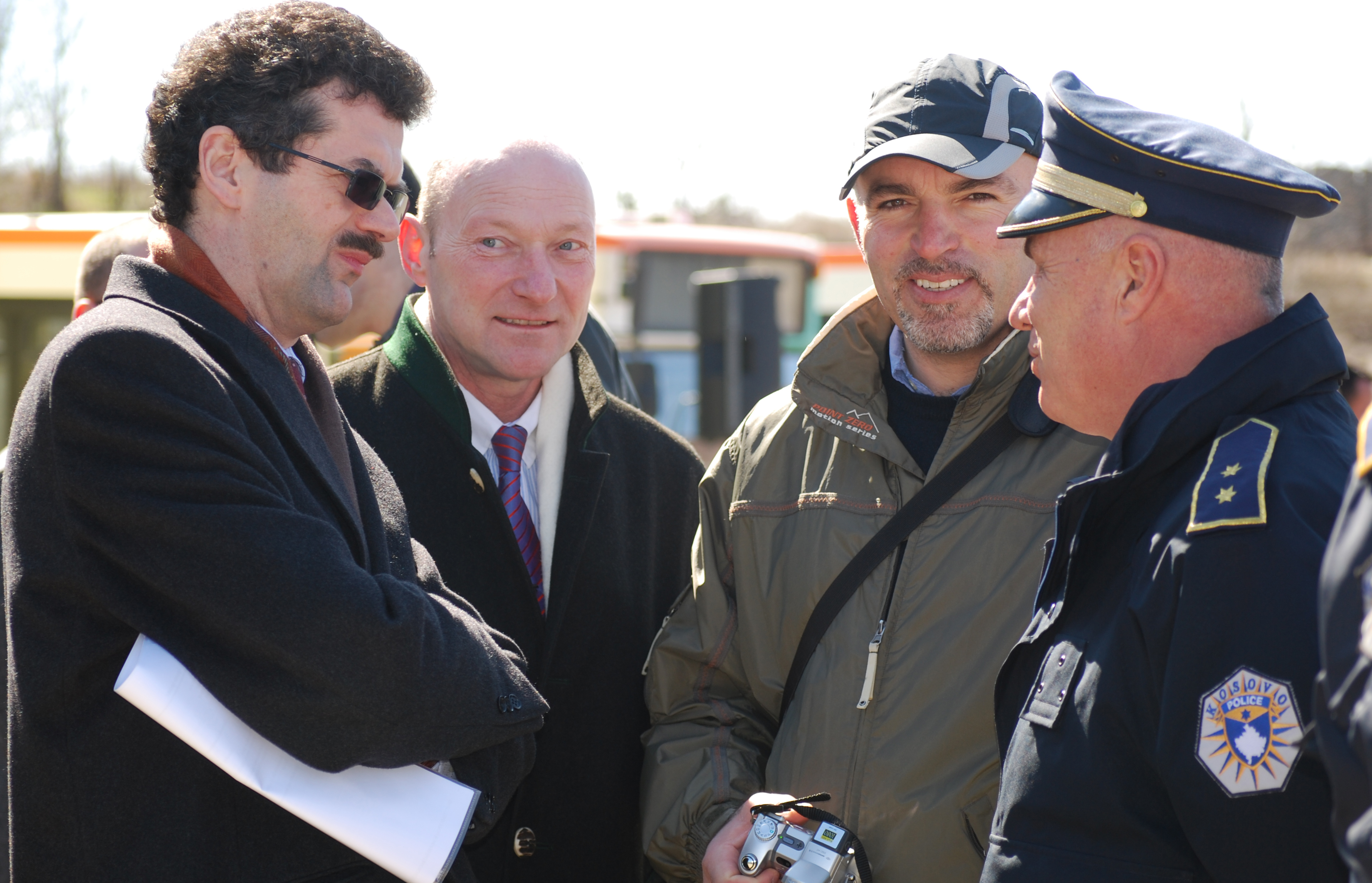 Werner Almhofer (l), Head of the OSCE Mission in Kosovo, Ulrich Biffar and Xhevdet Merovci of the Mission's Public Safety Development Section, talk to Lieutenant Colonel Driton Zabergja from Kosovo Police Service, Vushtrri/Vucitrn, 9 March 2009.