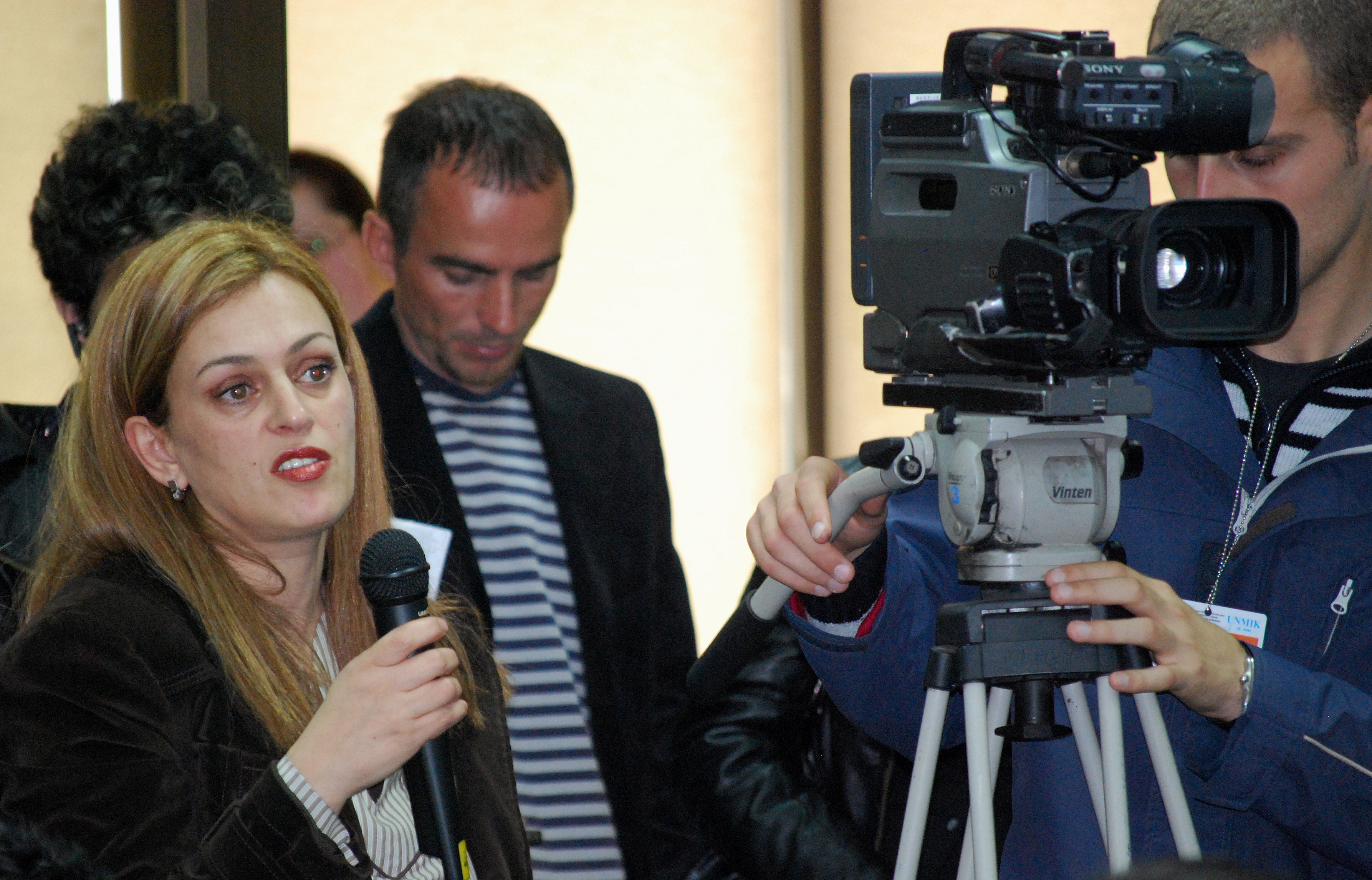 Journalist Drita Miftari from Radio Kosova asks a question at a press conference on the OSCE Mission's report on non-majority communities in the Kosovo education system, Prishtine/Pristina, 29 April 2009.