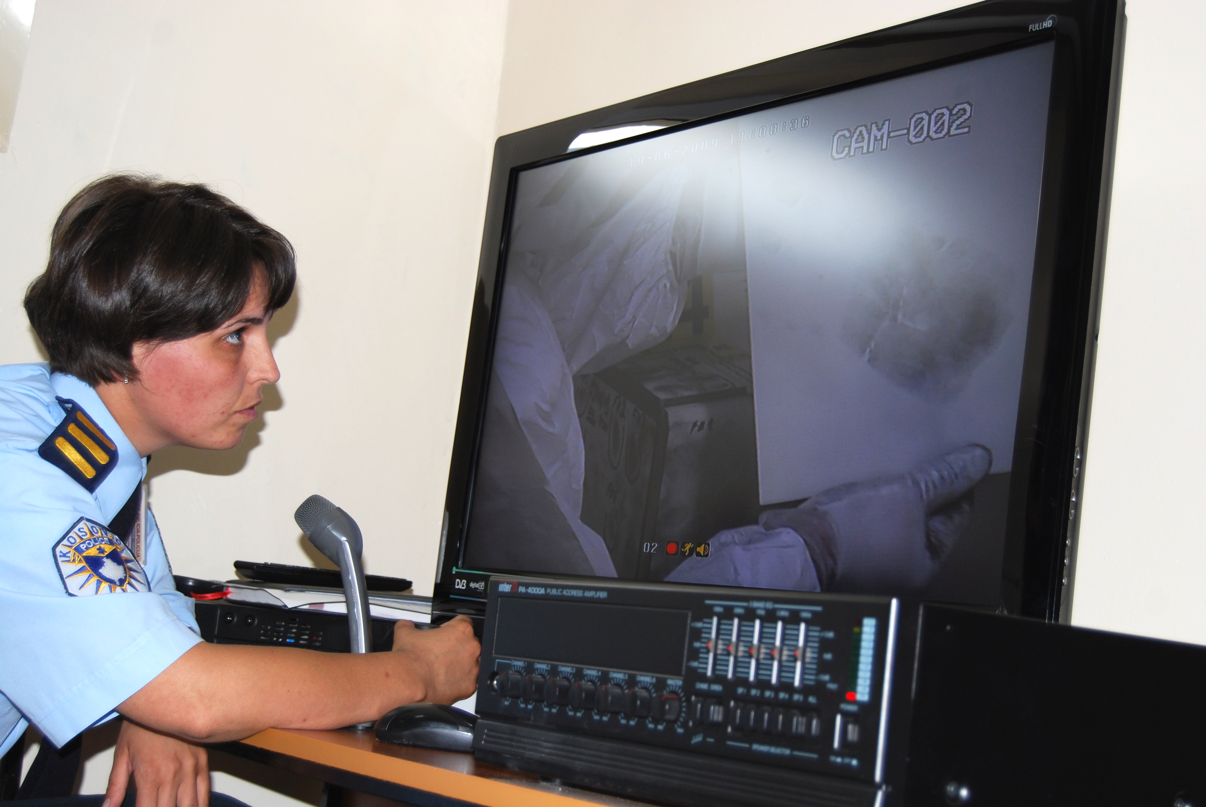 A Kosovo police service officer testing the newly-equipped crime scene simulation room in Vushtrri/Vucitrn, 17 June 2009.