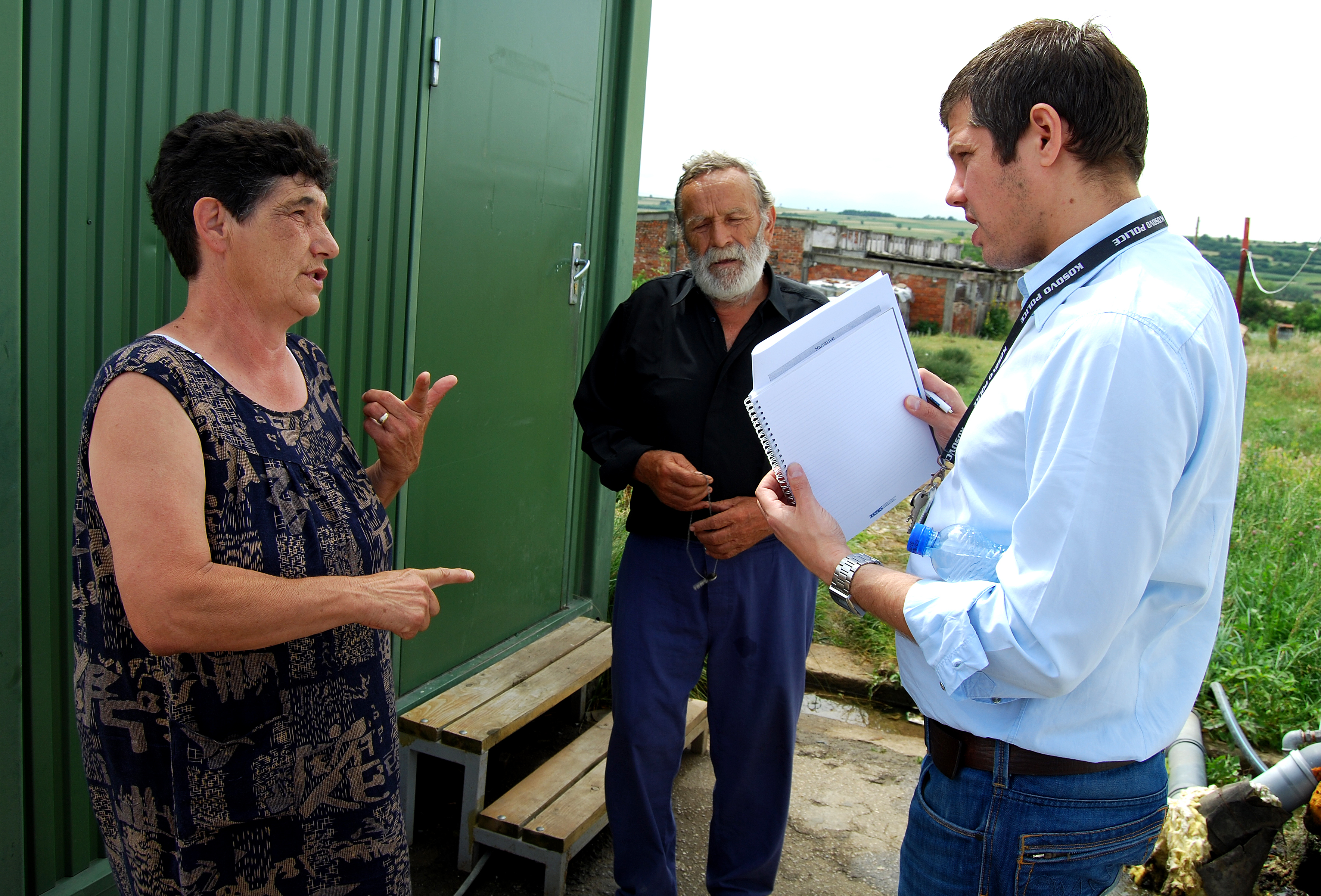 Olgica Subotic (l) and one of her neighbours in the Vocar settlement in Gracanice/Gracanica explain their dire living conditions to OSCE Mission in Kosovo Senior Public Affairs Officer Nikola Gaon (r), Kosovo, 18 June 2009.