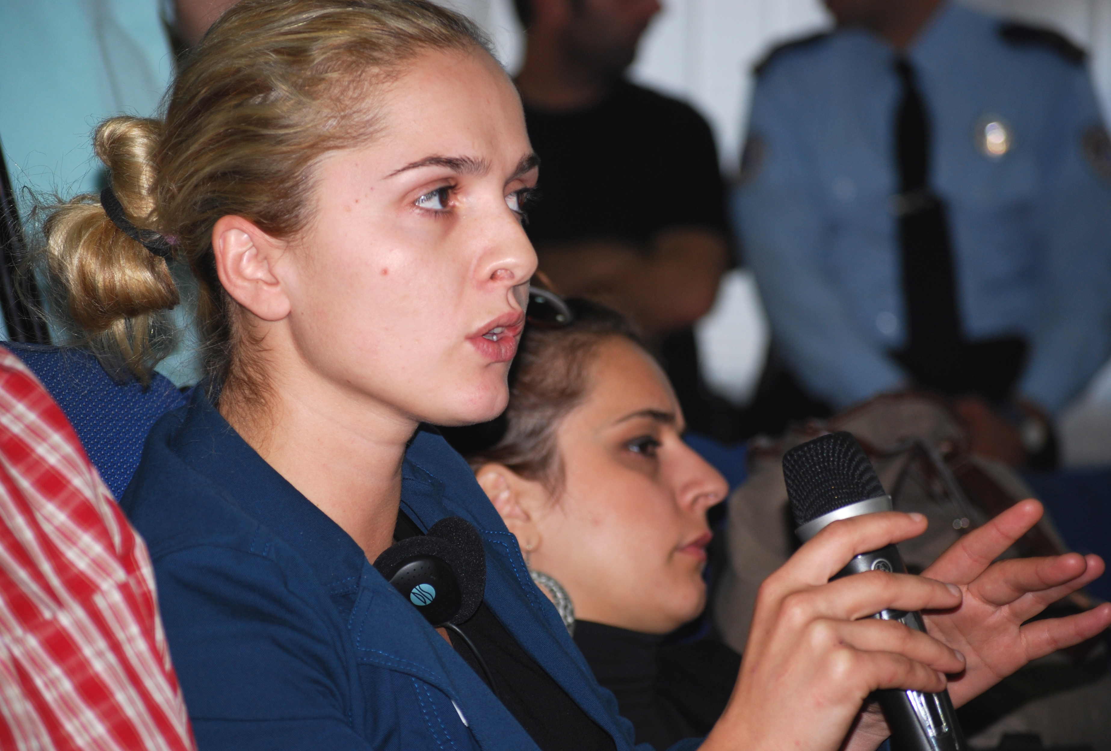 Top Channel TV journalist Valdete Osmani poses a question to the panel at the launch of a campaign to combat child begging sponsored by the OSCE Mission in Kosovo, Prishtine/Pristina, 9 October 2009.