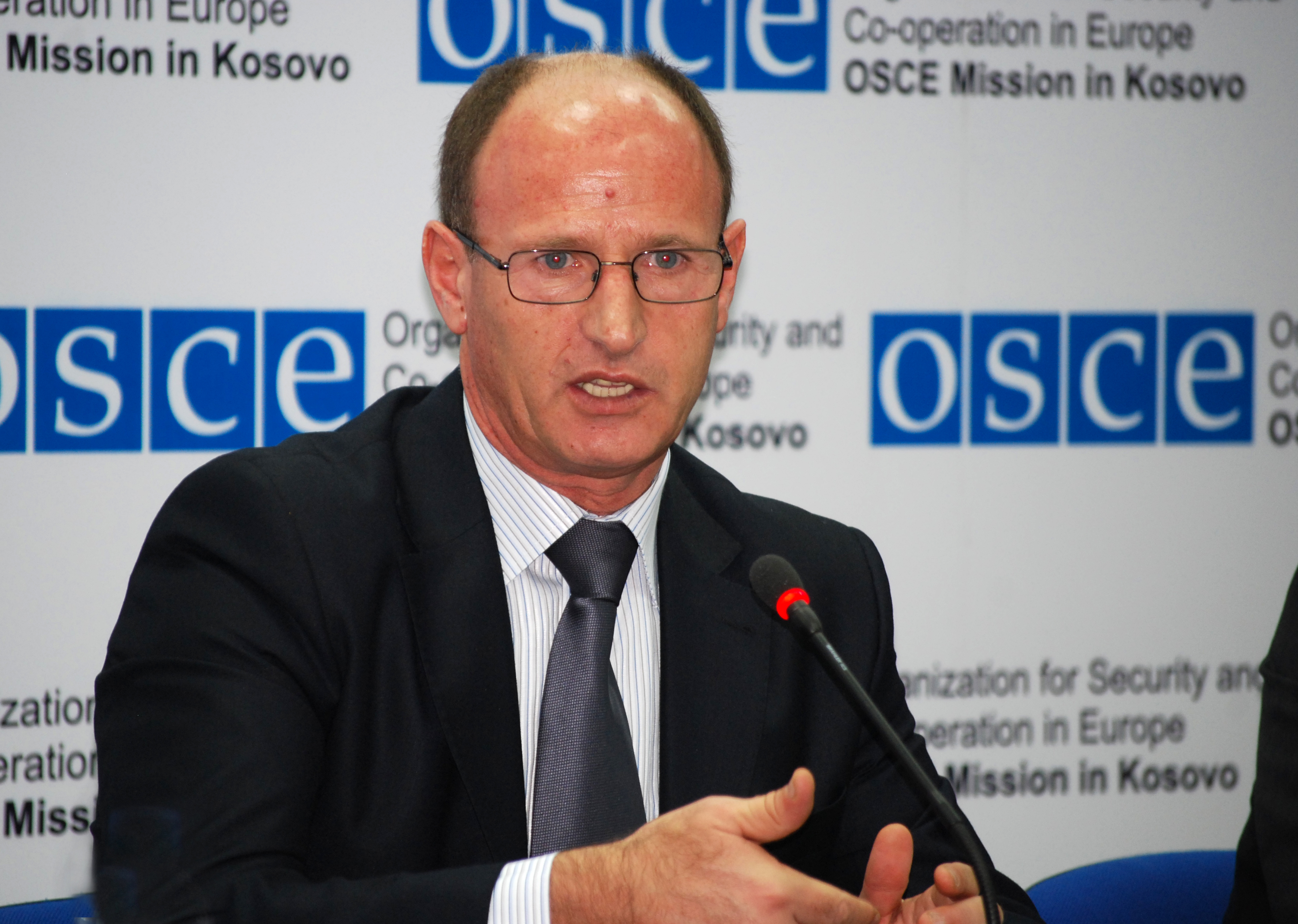 Sadri Ferati, Minister of Local Government Administration presents his views on the OSCE Mission in Kosovo's assessment report on the participation of non-majority communities in the municipal structures at a press conference , Pristina, 3 December 2009.