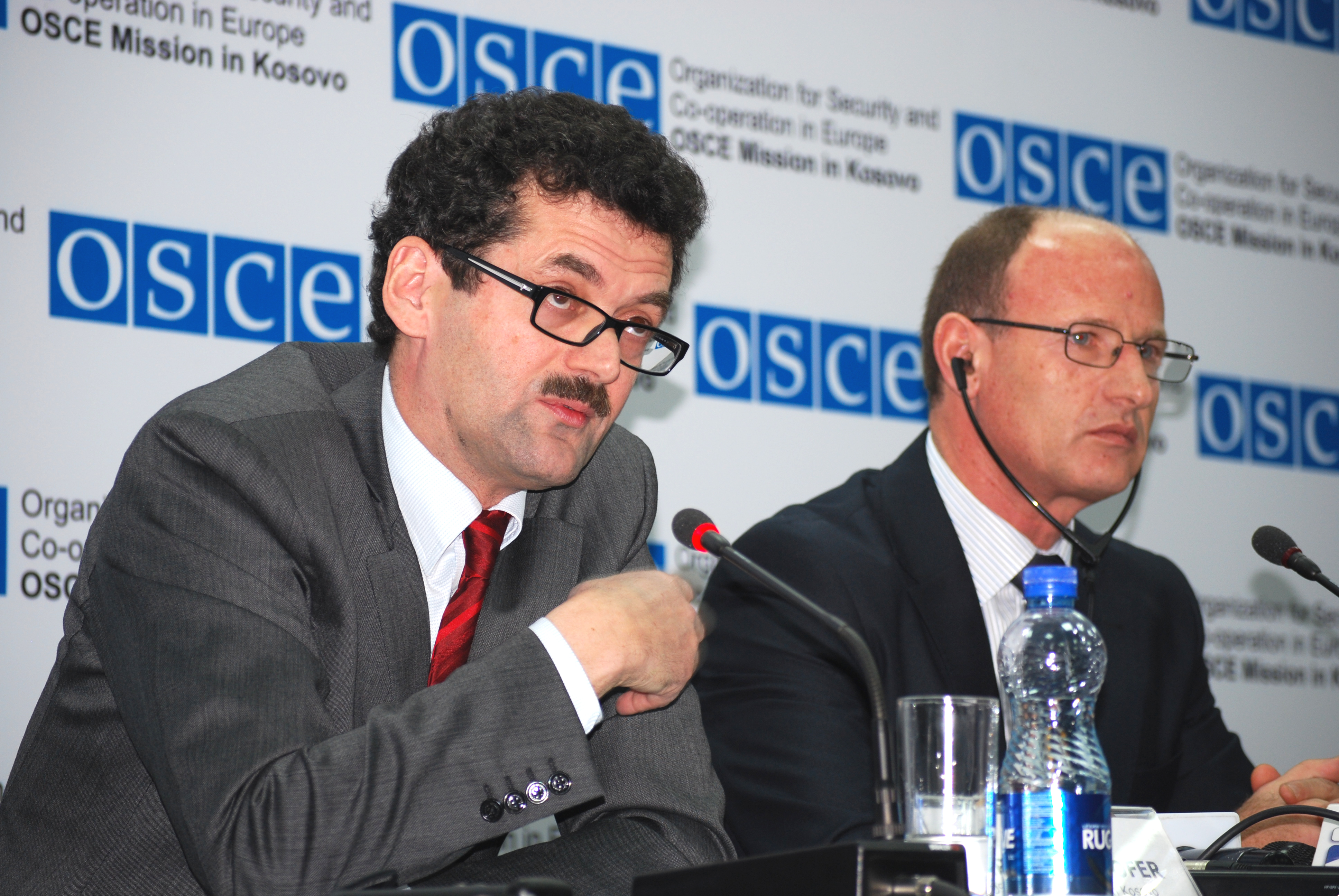 Werner Almhofer, Head of the OSCE Mission in Kosovo (l), and Sadri Ferati, Minister of Local Government Administration, present the Mission's report on participation of non-majority communities in municipal structures to media, Pristina, 3 December 2009.