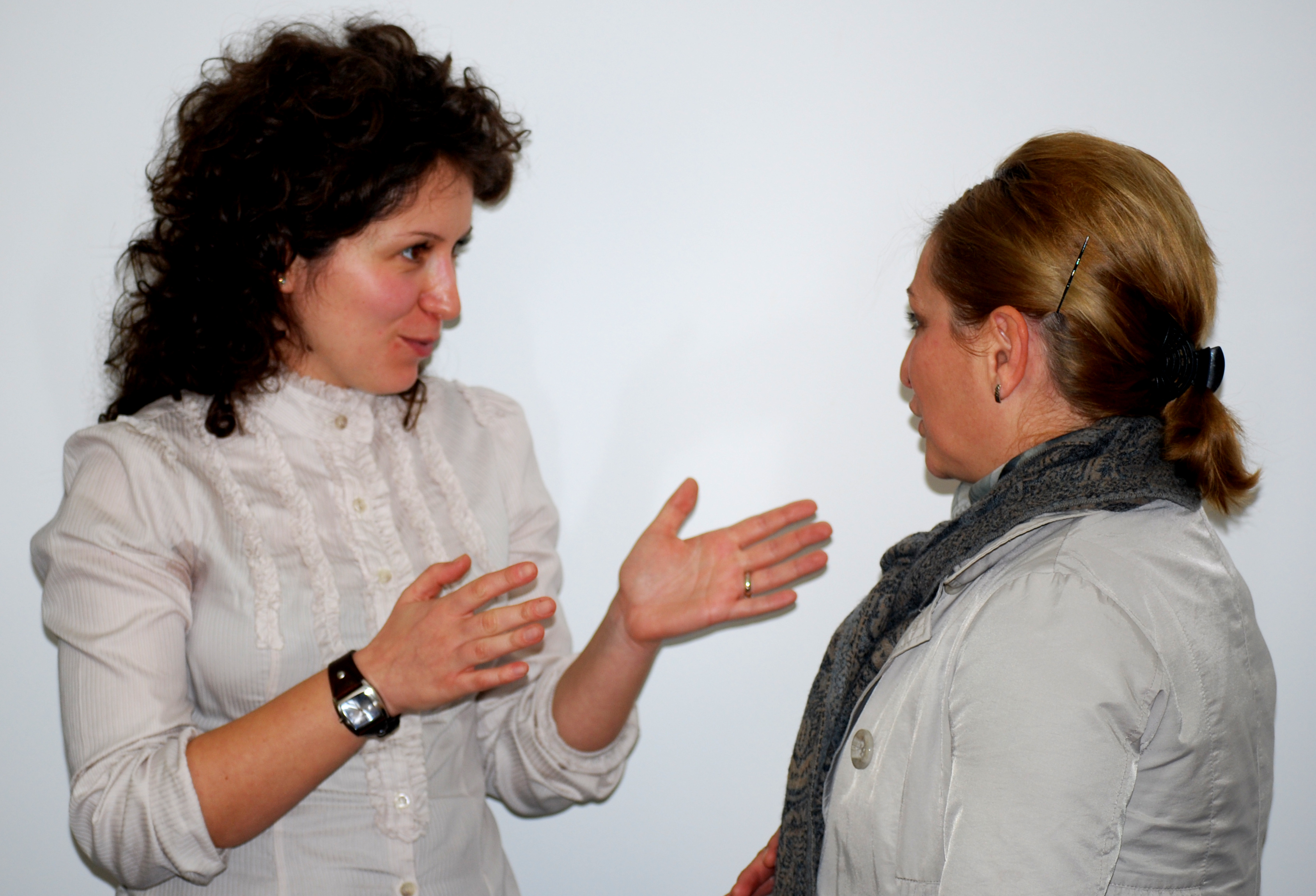 Dafina Hadri, OSCE National Legal Adviser on Women and Children, talks to Ganimete Kitmiri, advisor at the Kosovo Ministry of Justice, at the launch of the Mission's anti-trafficking campaign in Prizren, 4 December 2009.