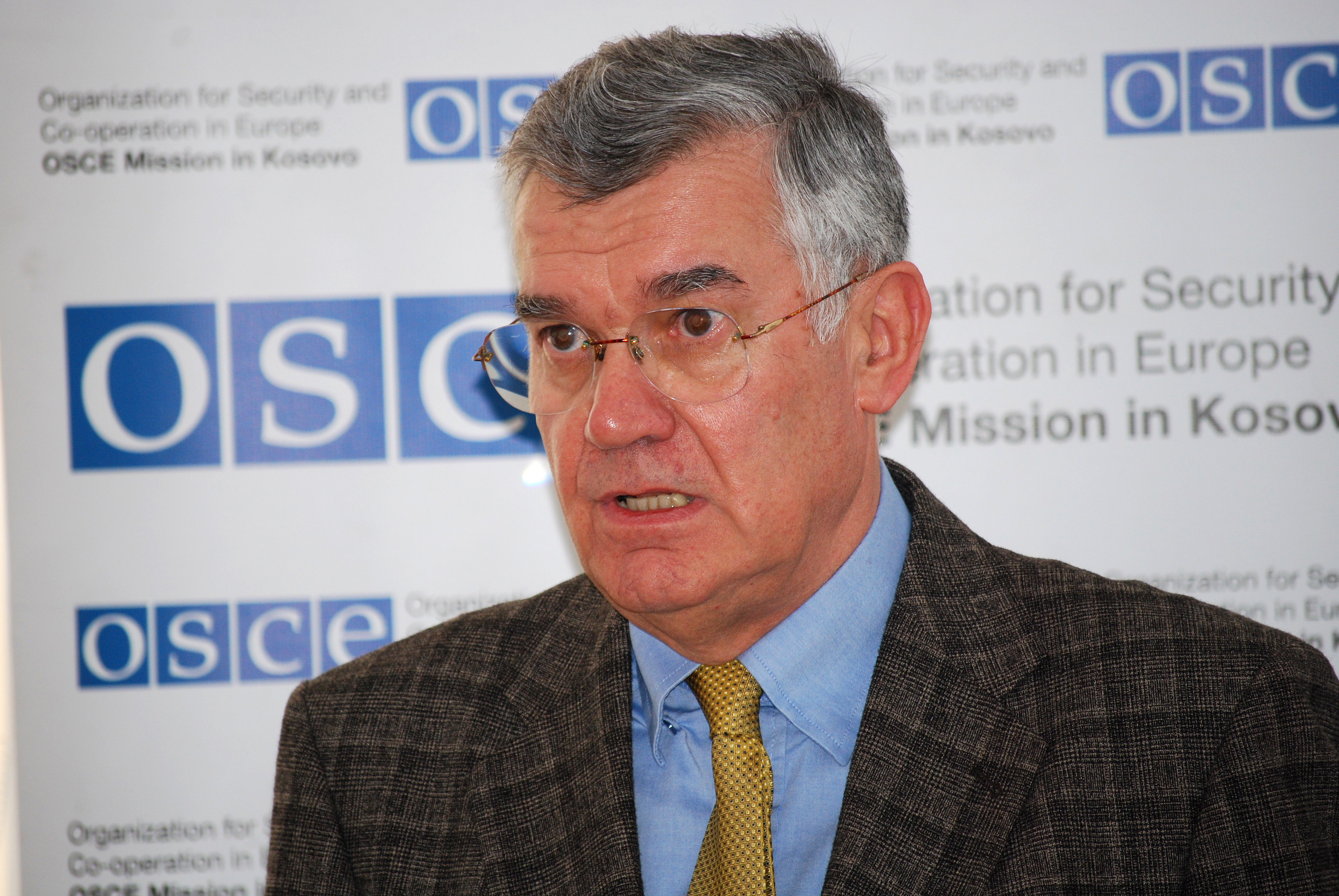Francis Carlier, Director of the OSCE Regional Office in Prizren, talks to the media at the launch of the Mission's anti-trafficking campaign in Prizren, 4 December 2009.