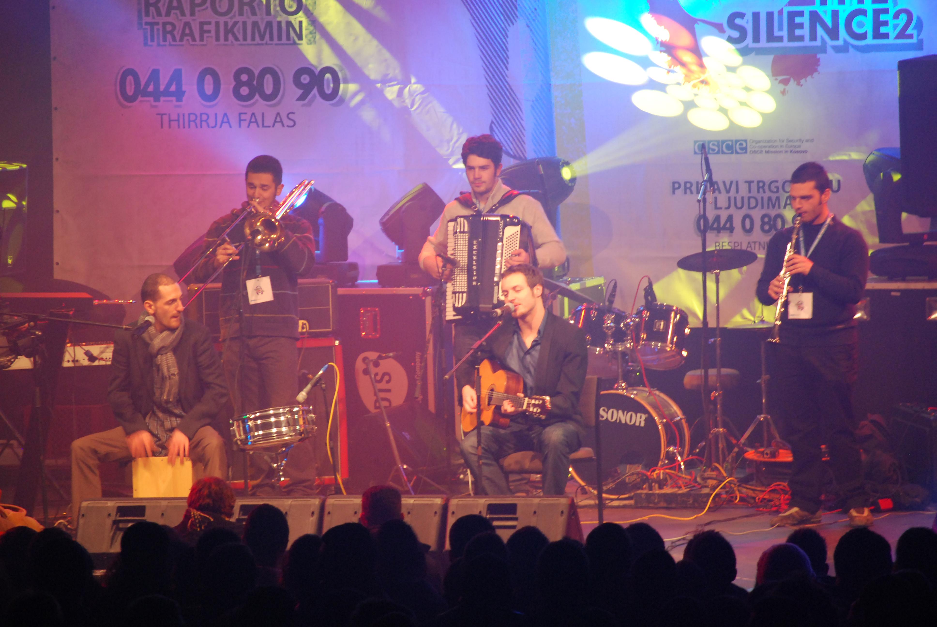 A band performs at a "Rock to break the silence 2! Report human trafficking!" concert to promote Kosovo's anti-trafficking helpline, Prishtine/Pristina, 10 December 2009.