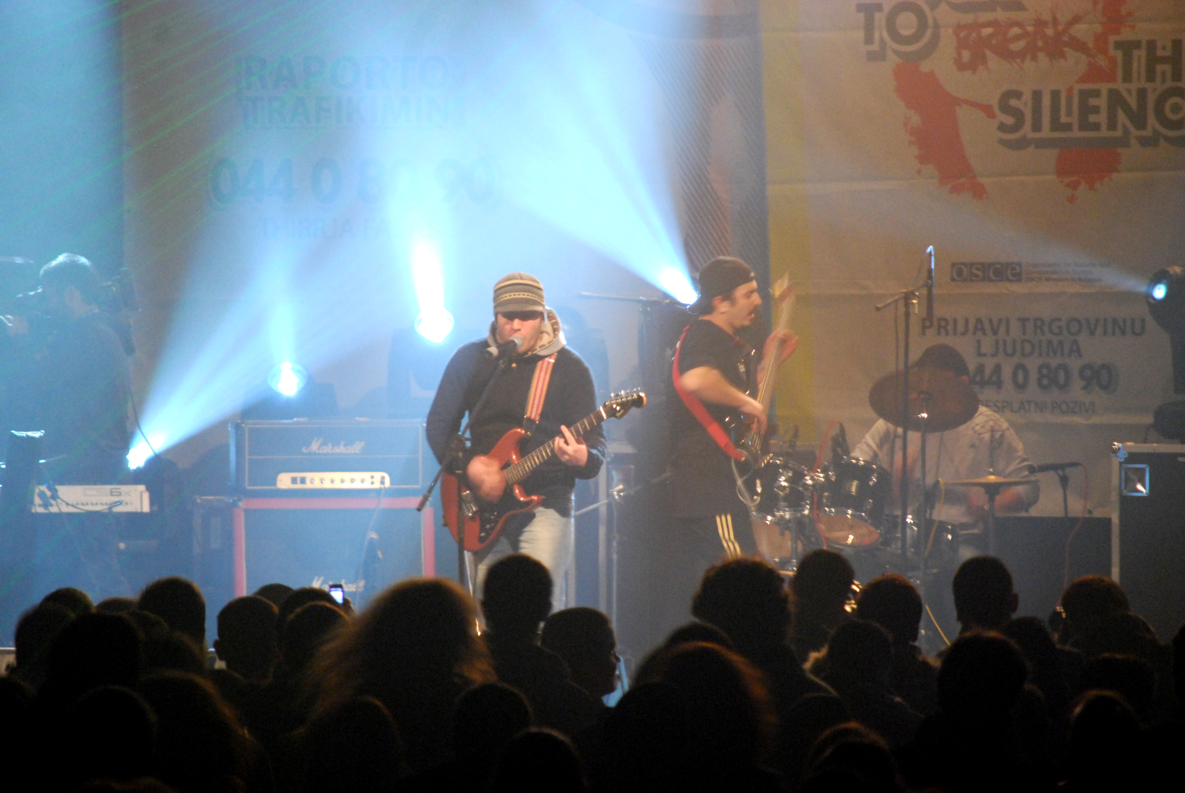 A band performs at a "Rock to break the silence 2! Report human trafficking!" concert to promote Kosovo's anti-trafficking helpline, Prishtine/Pristina, 10 December 2009.