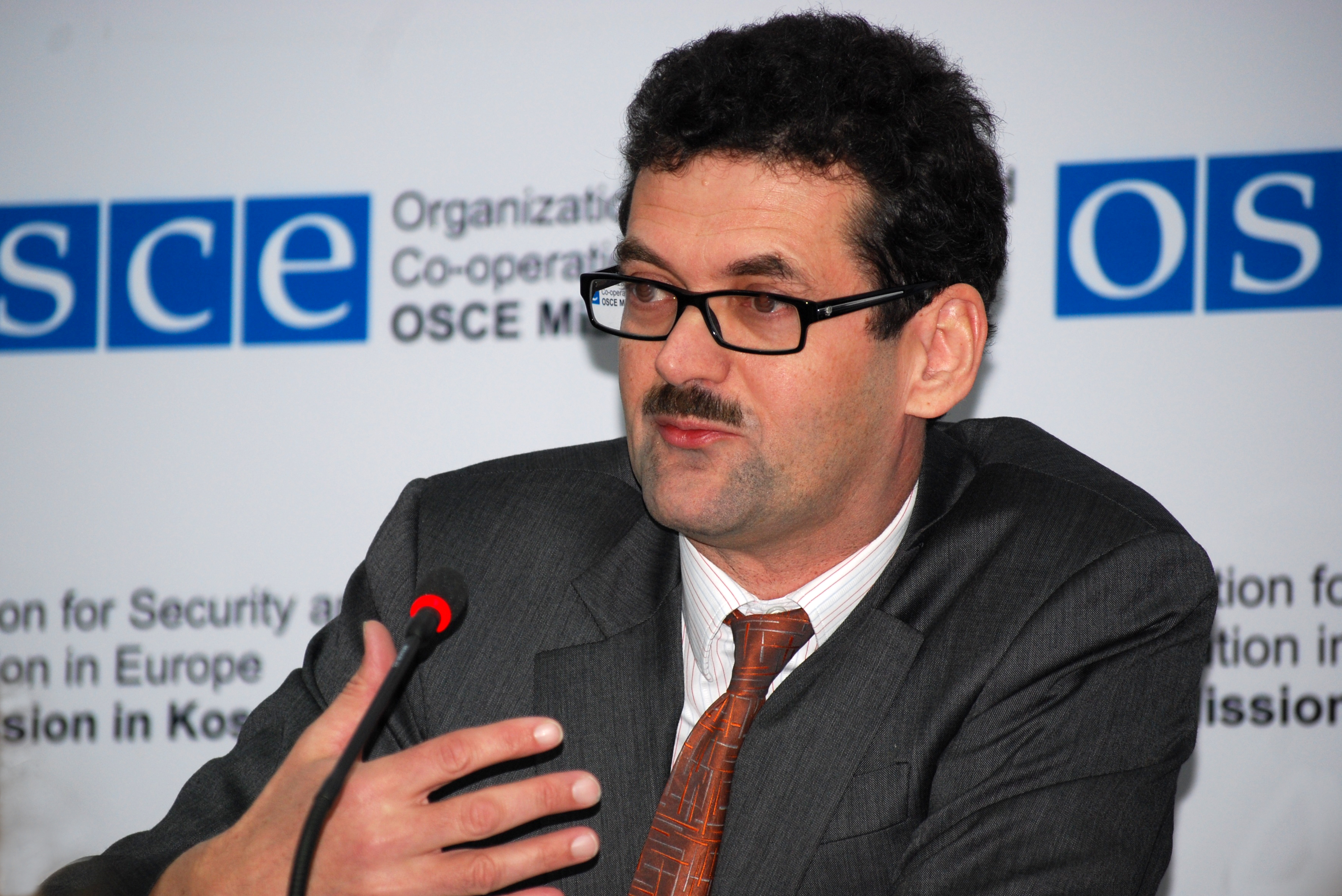 Head of OSCE Mission in Kosovo Ambasador Werner Almhofer explains to the media the Mission's campaign to support the Independent Oversight Board, Prishtine/Pristina, 14 December 2009.
