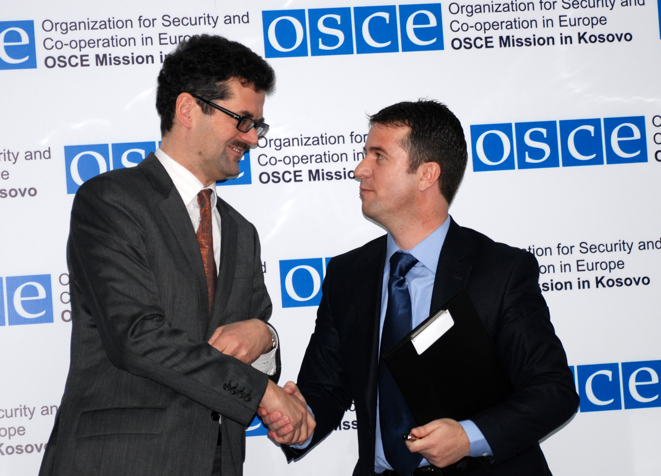 Head of the OSCE Mission in Kosovo Ambasador Werner Almhofer shaking hands with the Chief of the Independent Oversight Board (IOB) Mehdi Geci, at the launch of the Mission in Kosovo's campaign in support of the IOB, Prishtine/Pristina, 14 December 2009.