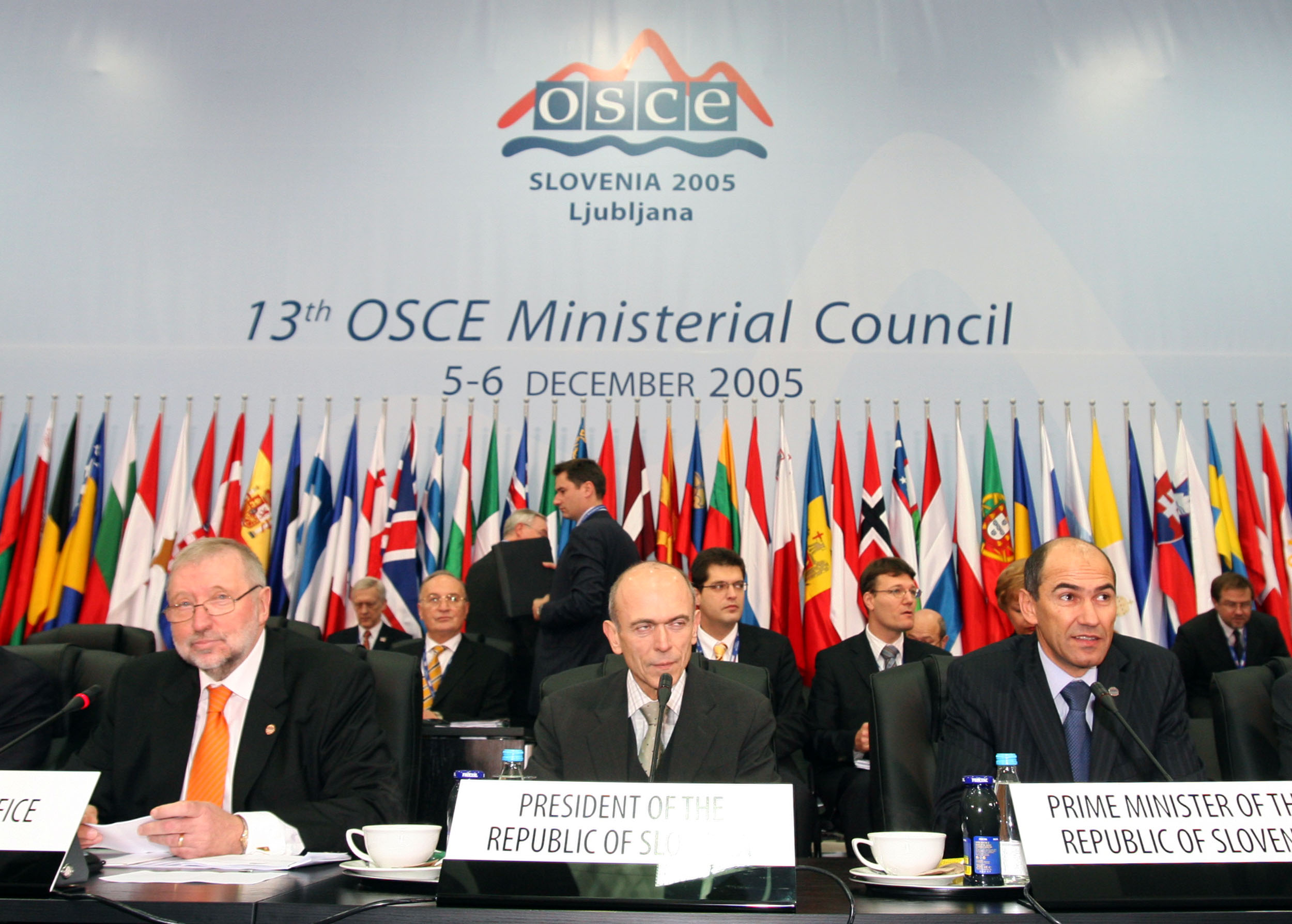 OSCE Chairman-in-Office Dimitrij Rupel (left) with Slovenian President Janez Drnovsek (centre) and Prime Minister Janez Jansa at the opening of the 13th OSCE Ministerial Council in Ljubljana, 5 December 2005.