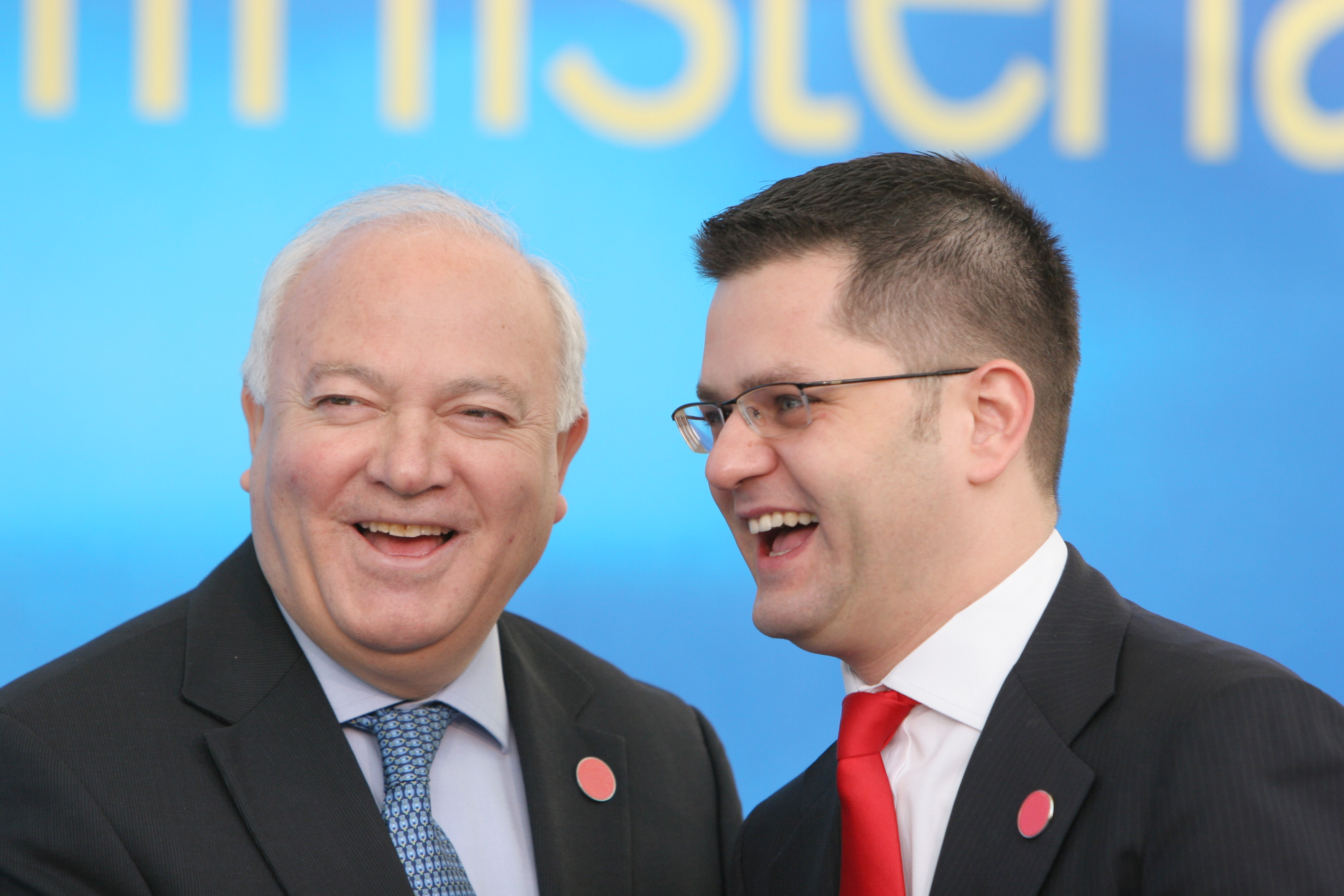 OSCE Chairman-in-Office, Spanish Foreign Minister Miguel Angel Moratinos (left), welcomes Serbian Foreign Minister Vuk Jeremic at the 15th OSCE Ministerial Council in Madrid, 29 November 2007.