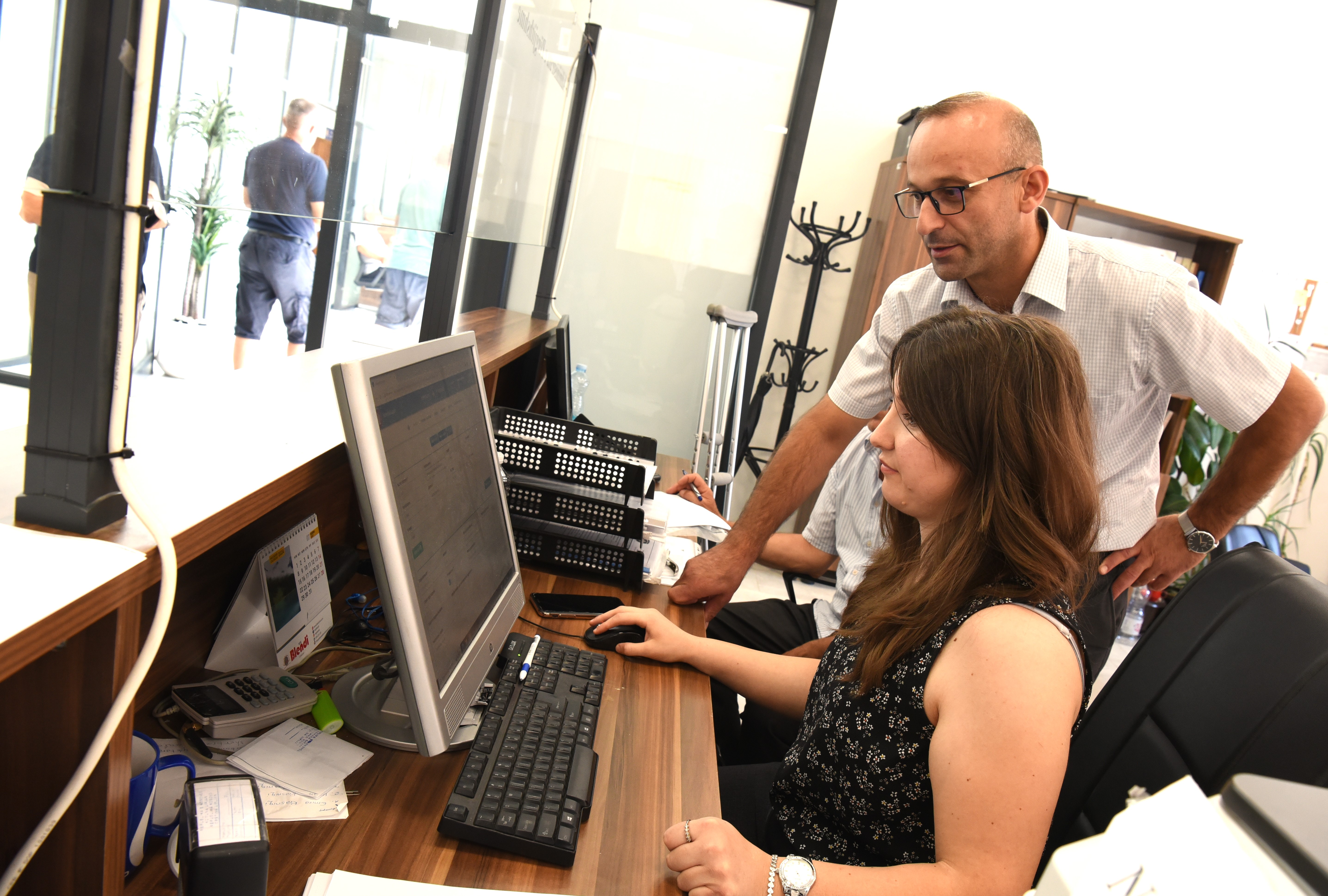 Malborë Qerimi duke i treguar Burim Gashit Kryesues i Seksionit të Administratës së Përgjithshme, një bashkërendimin të kërkesave të banorëve, gjatë praktikës së saj në komunën e Lipjanit.