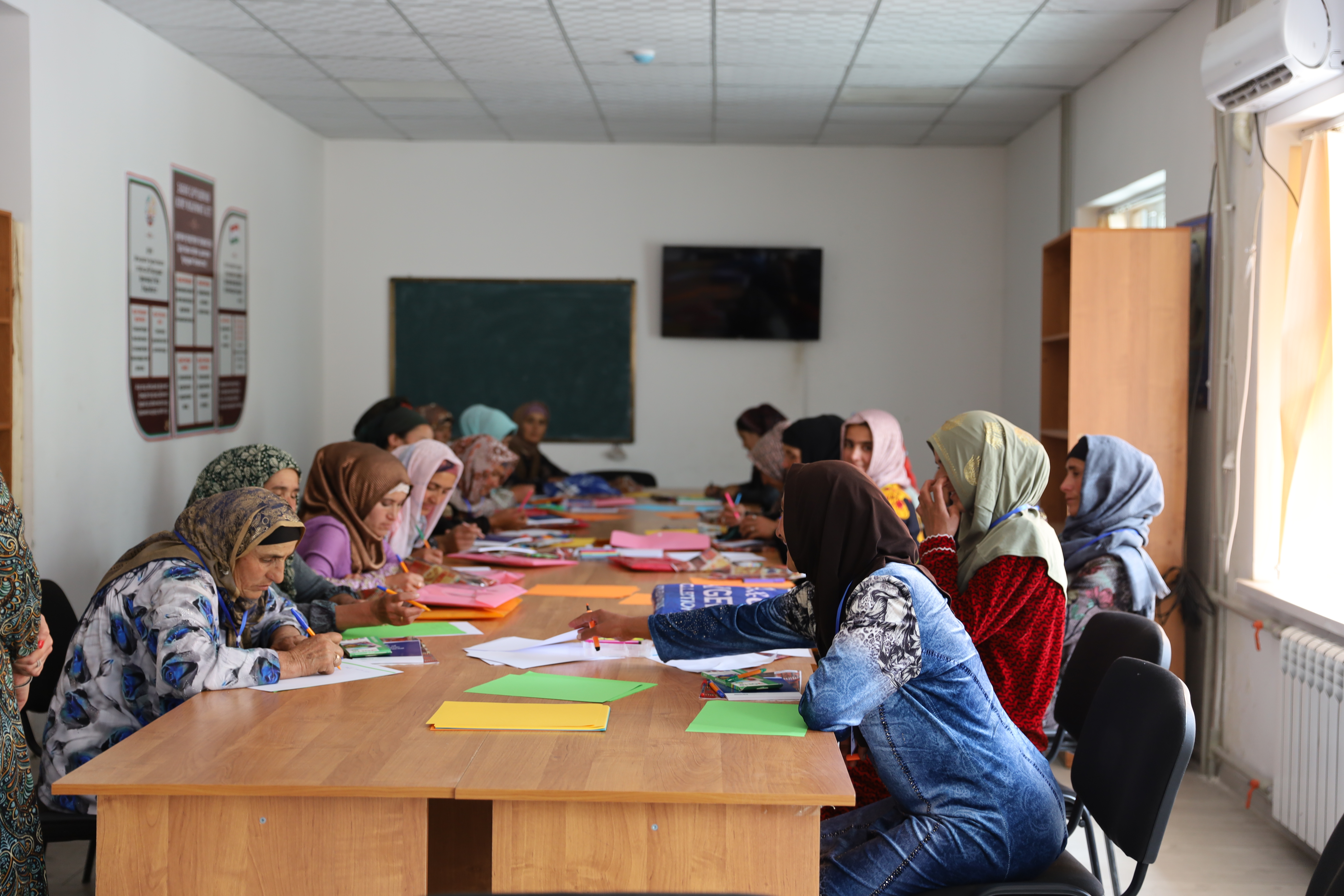 Beneficiary women receiving training on soft skills such as self-awareness, self-esteem and confidence, delivered at a boarding school in Jamoat Anzob, Ayni district, Soghd region, Republic of Tajikistan, 10 August 2023.