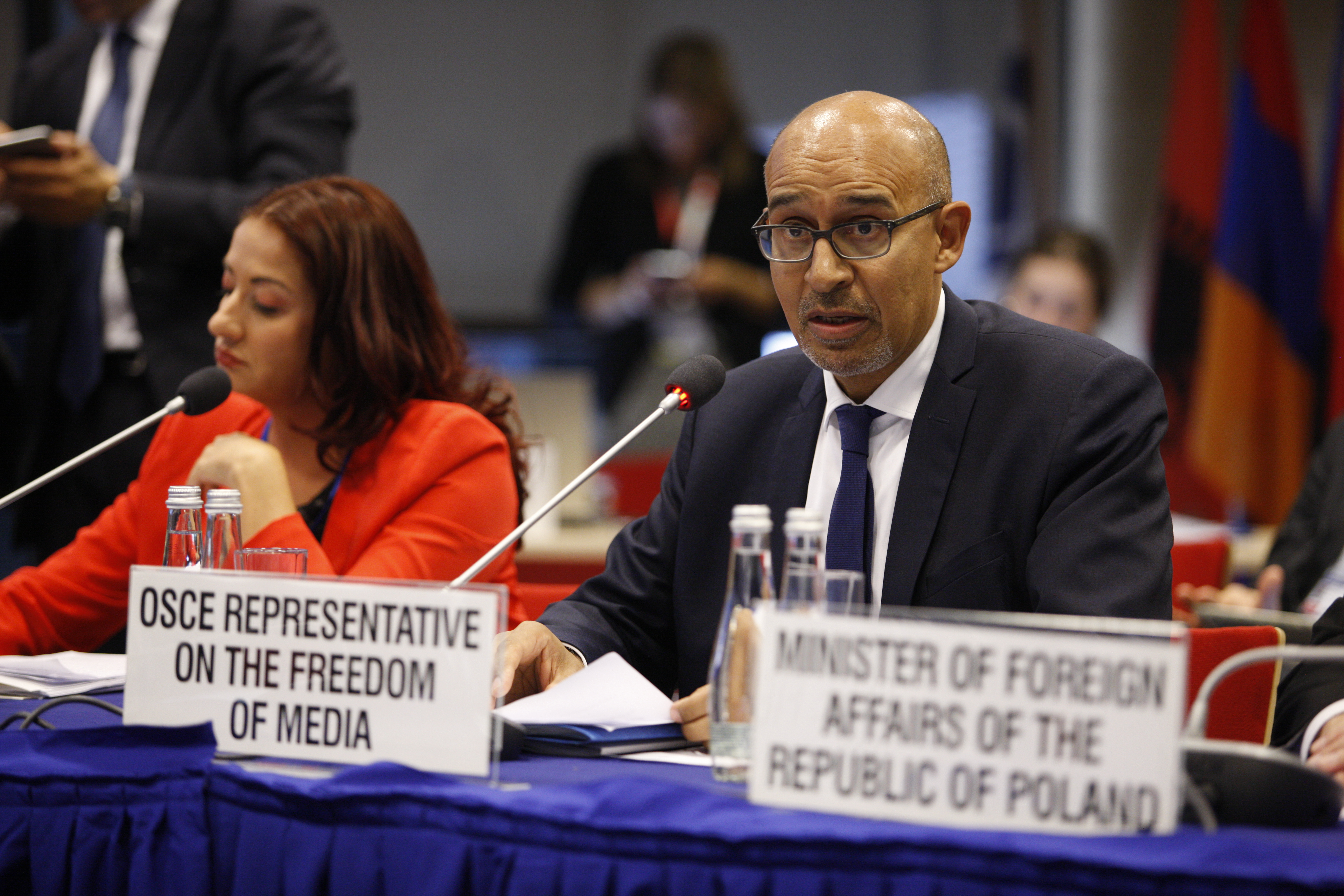 Harlem Désir, the OSCE Representative on Freedom of the Media, speaks during the Opening Plenary Session of the 2017 Human Dimension Implementation Meeting in Warsaw, 11 September 2017.