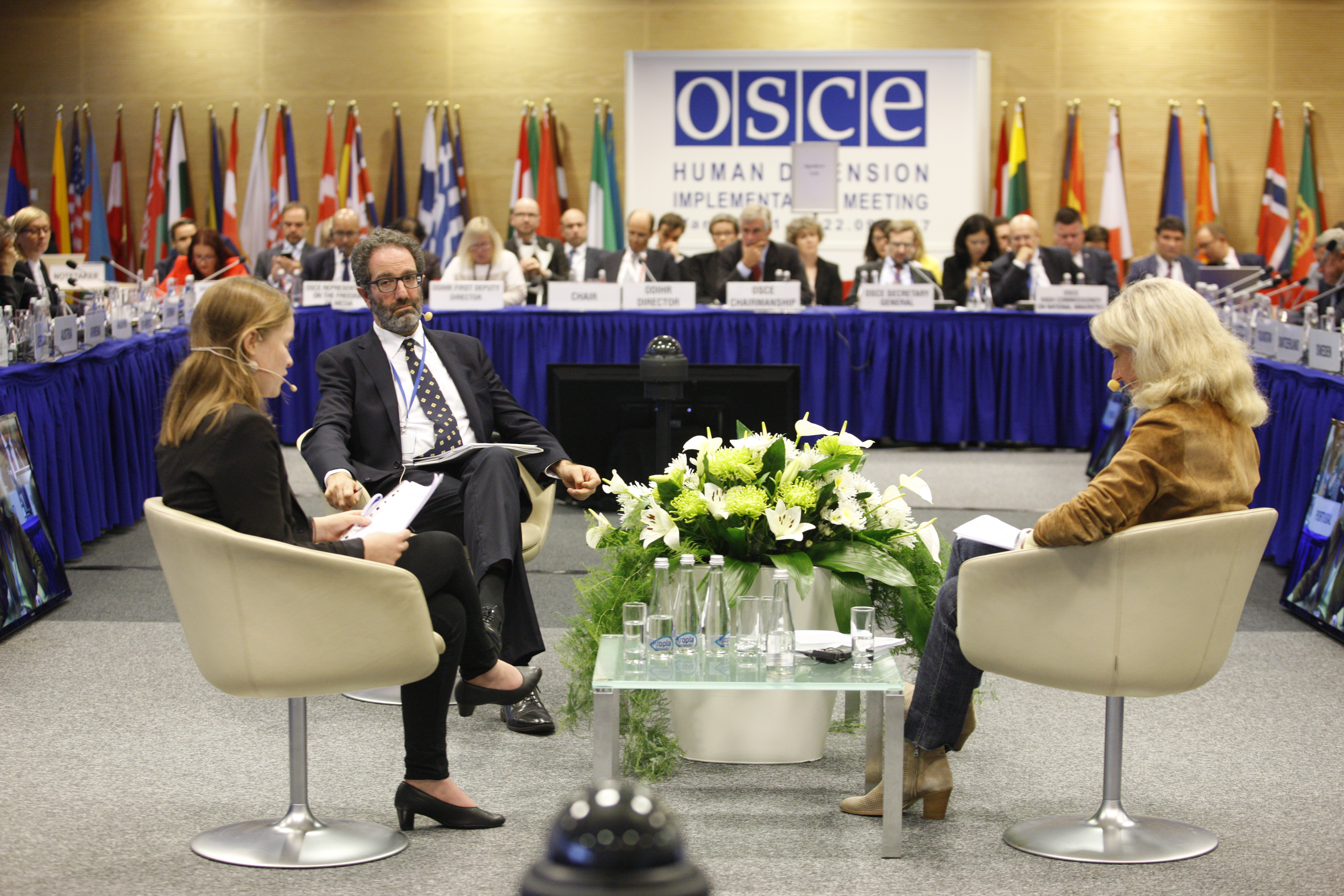 Claudia Luciani, Director of Democratic Governance at the Council of Europe's Directorate General of Democracy and Jonathan Cohen, Executive Director of Conciliation Resources, discuss key issues that threaten the human dimension in the OSCE region and how the organisation should respond during a high-level panel moderated by journalist Annabelle Chapman. The panel was part of the Opening Plenary Session of the OSCE Human Dimension Implementation Meeting in Warsaw on 11 September 2017.