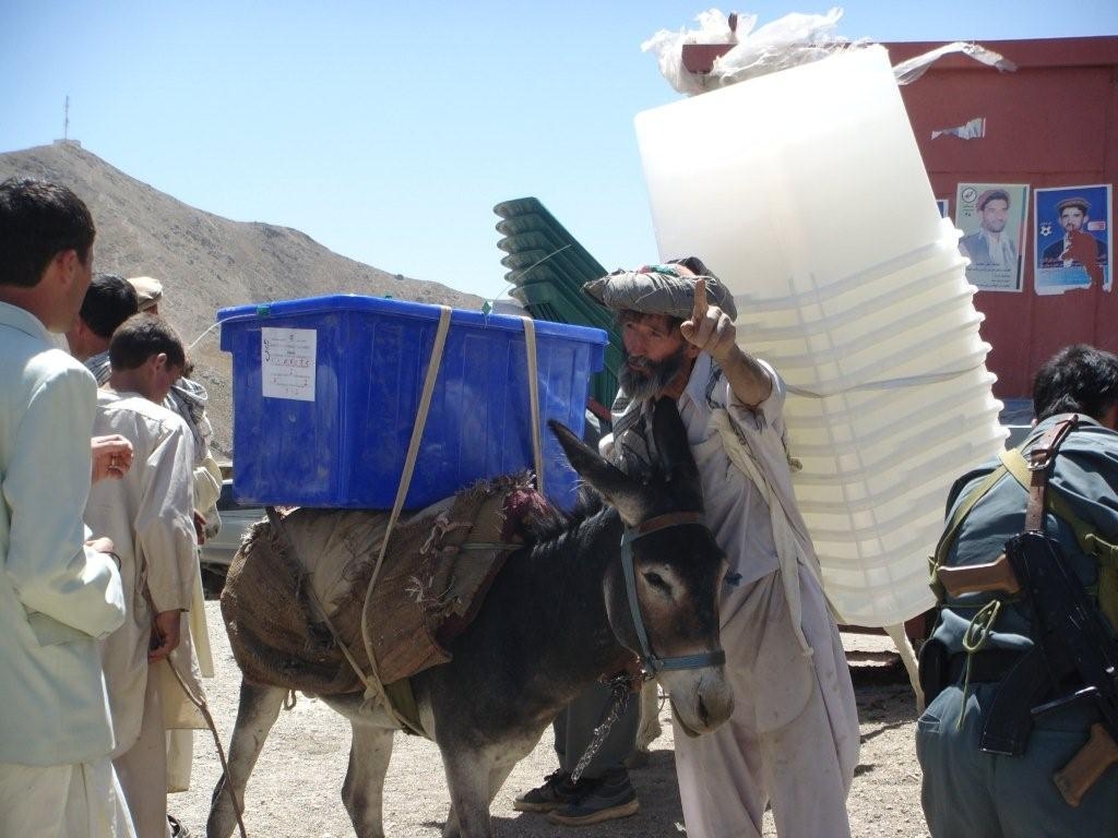 Voting materials for the 20 August 2009 presidential election in Afghanistan being sent from Mara village to Sighwar village in Pahshir on donkeys and the backs of their owners, 19 August 2009.