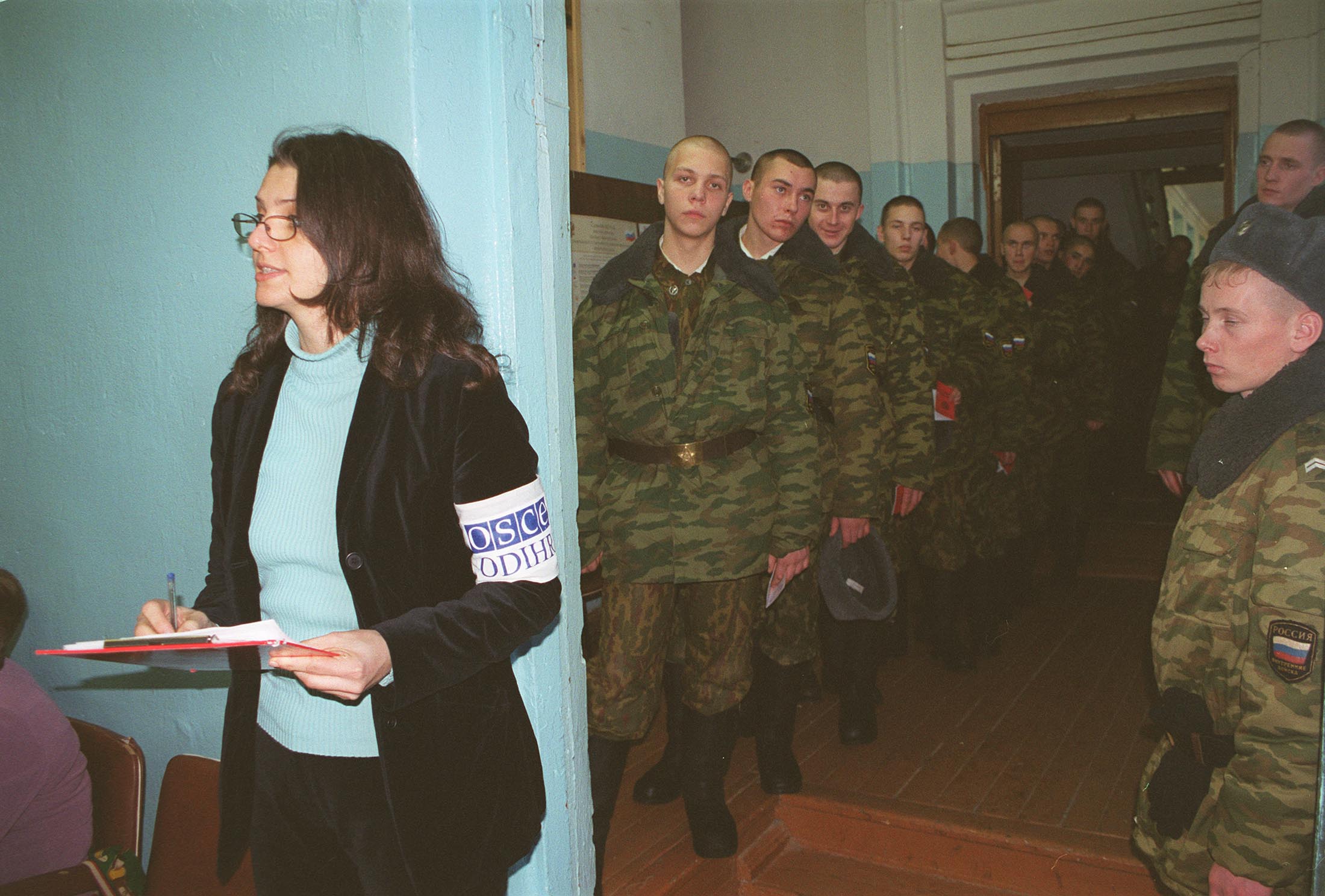 An OSCE observer at a polling station in the town of Balashikha outside Moscow, where Interior Ministry soldiers line up to vote for the Duma elections, 7 December 2003.