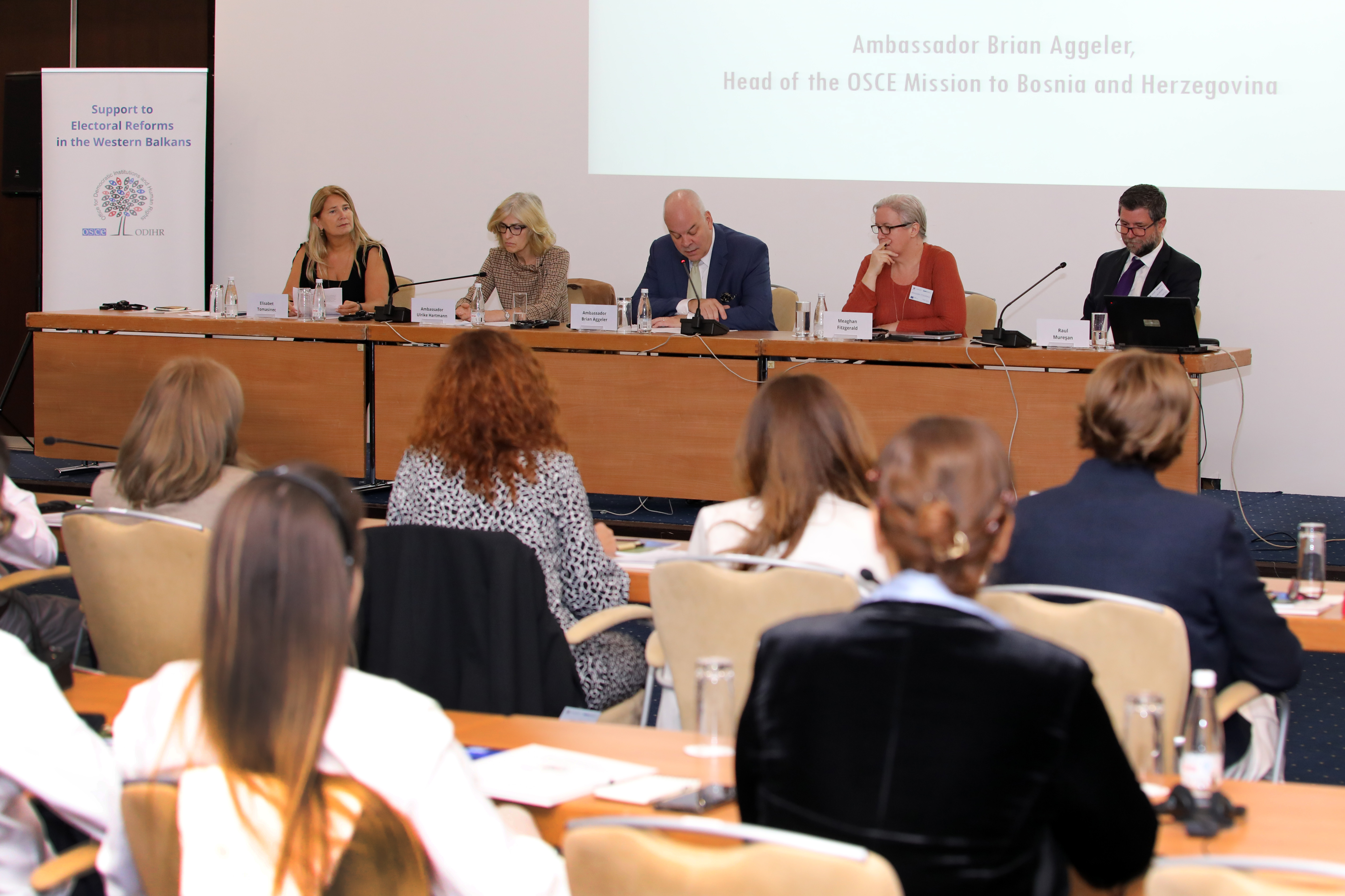 Representatives of election management bodies, civil society and local and international election experts take part in a conference on enhancing the effectiveness of election administration, organized by ODIHR in co-operation with the OSCE Mission to Bosnia and Herzegovina. Sarajevo, 26 September 2023.