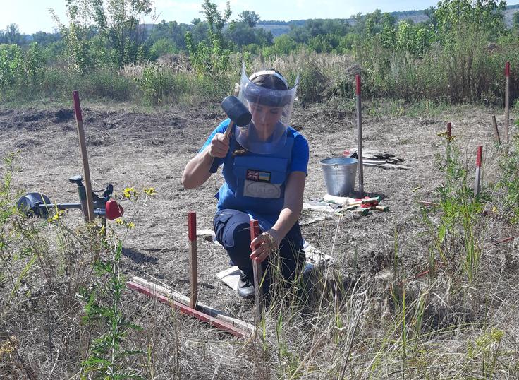 A deminer is working to find dangerous object in the field near Sloviansk, Donetsk oblast, 19 August 2020.