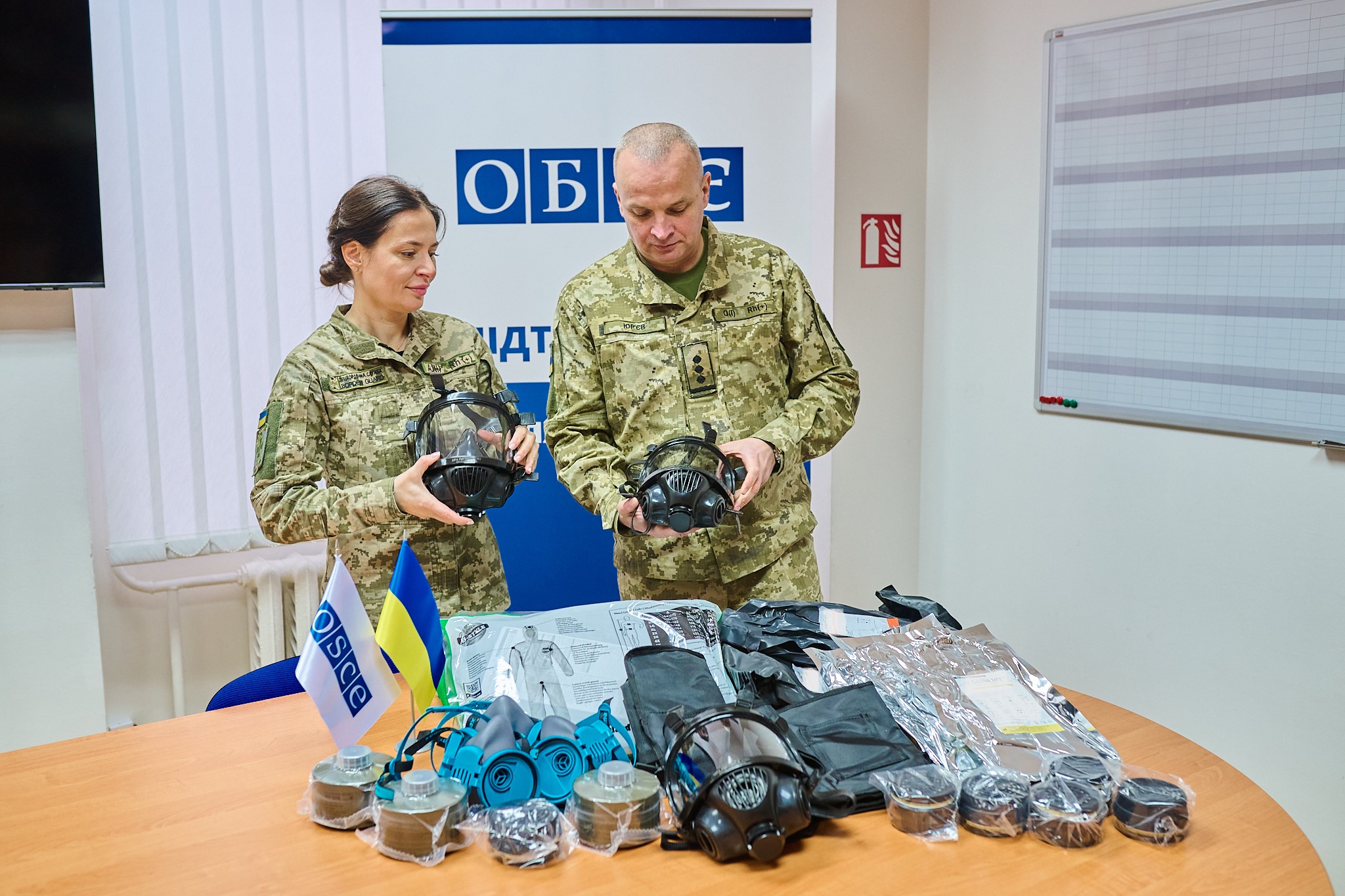 Representatives of Ukraine's State Border Guards Service review samples of the protective gear, provided by the OSCE for enhancing response to chemical emergencies. Kyiv, 20 November 2025.