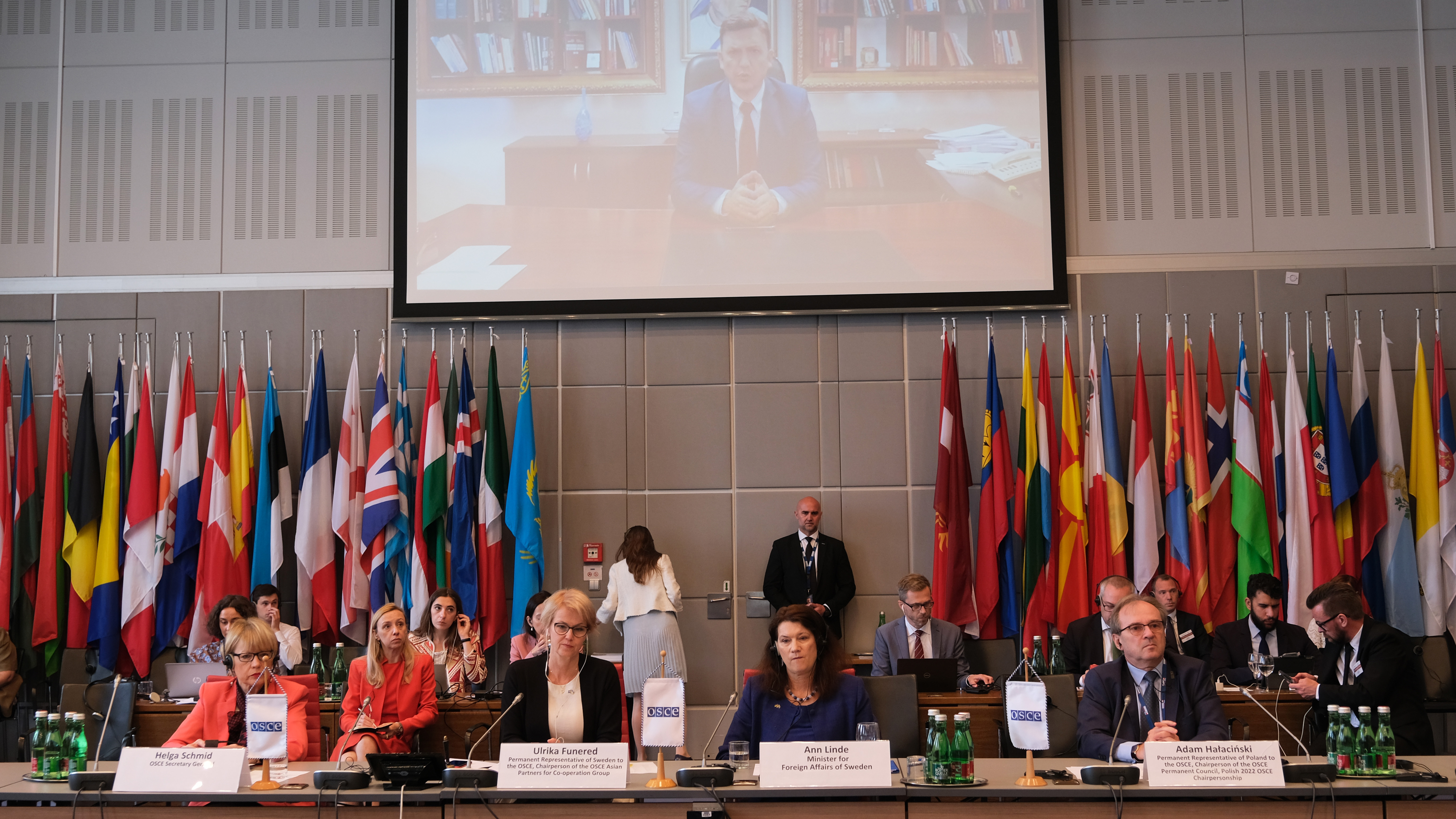 OSCE Secretary General Helga Maria Schmid, Ambassador Ulrika Funered, Permanent Representative of Sweden to the OSCE, Swedish Foreign Minister Ann Linde, and Ambassador Adam Hałaciński, Permanent Representative of Poland to the OSCE, Chairperson of the OSCE Permanent Council, at the 2022 OSCE Asian Conference held in Vienna on 15 June 2022.