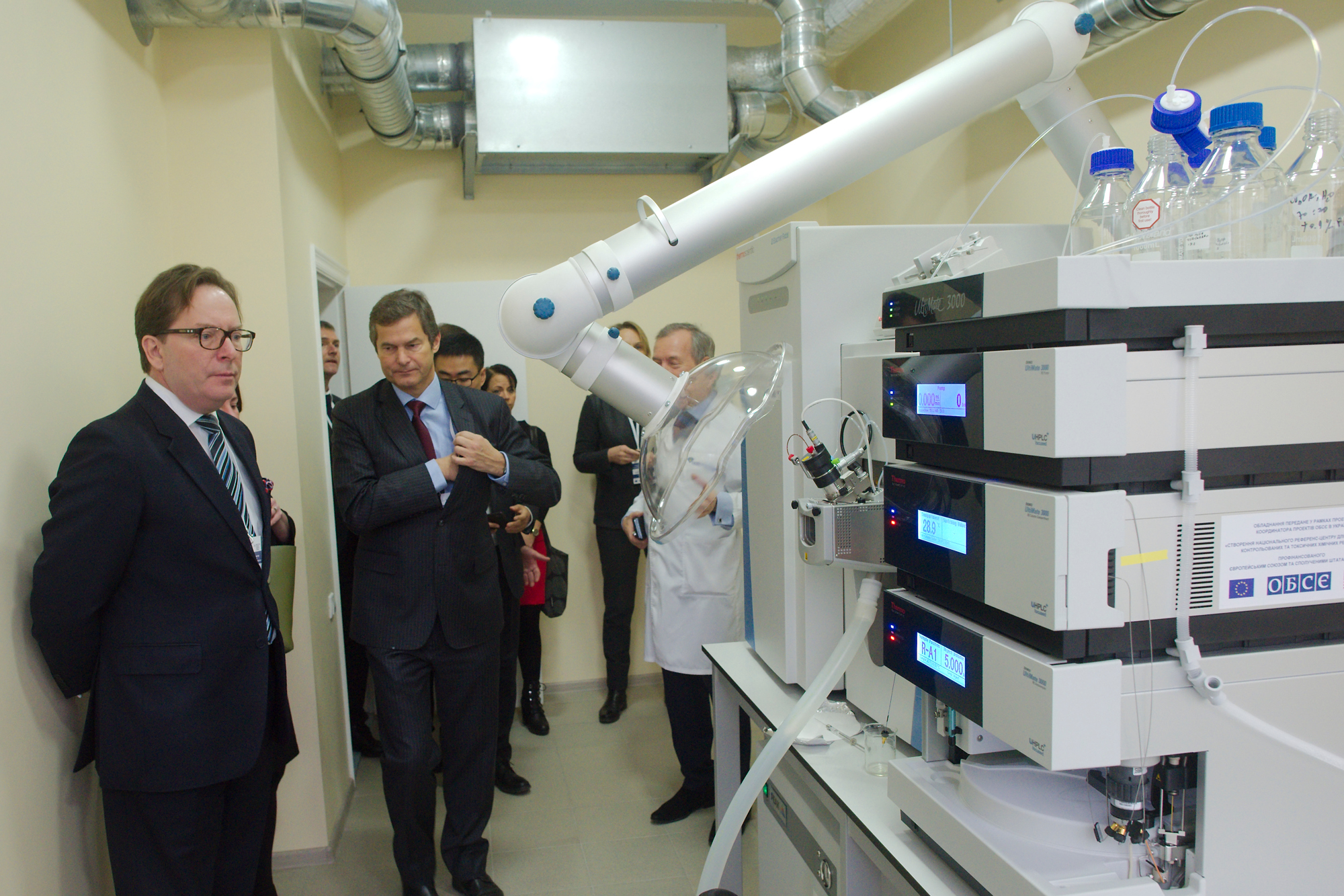 Henrik Villadsen, the OSCE Project Co-ordinator in Ukraine (left) examines the equipment, provided to Medved’s Research Center of Preventive Toxicology, Food and Chemical Safety to enhance its ability to identify unknown substances. Kyiv, 10 December 2019