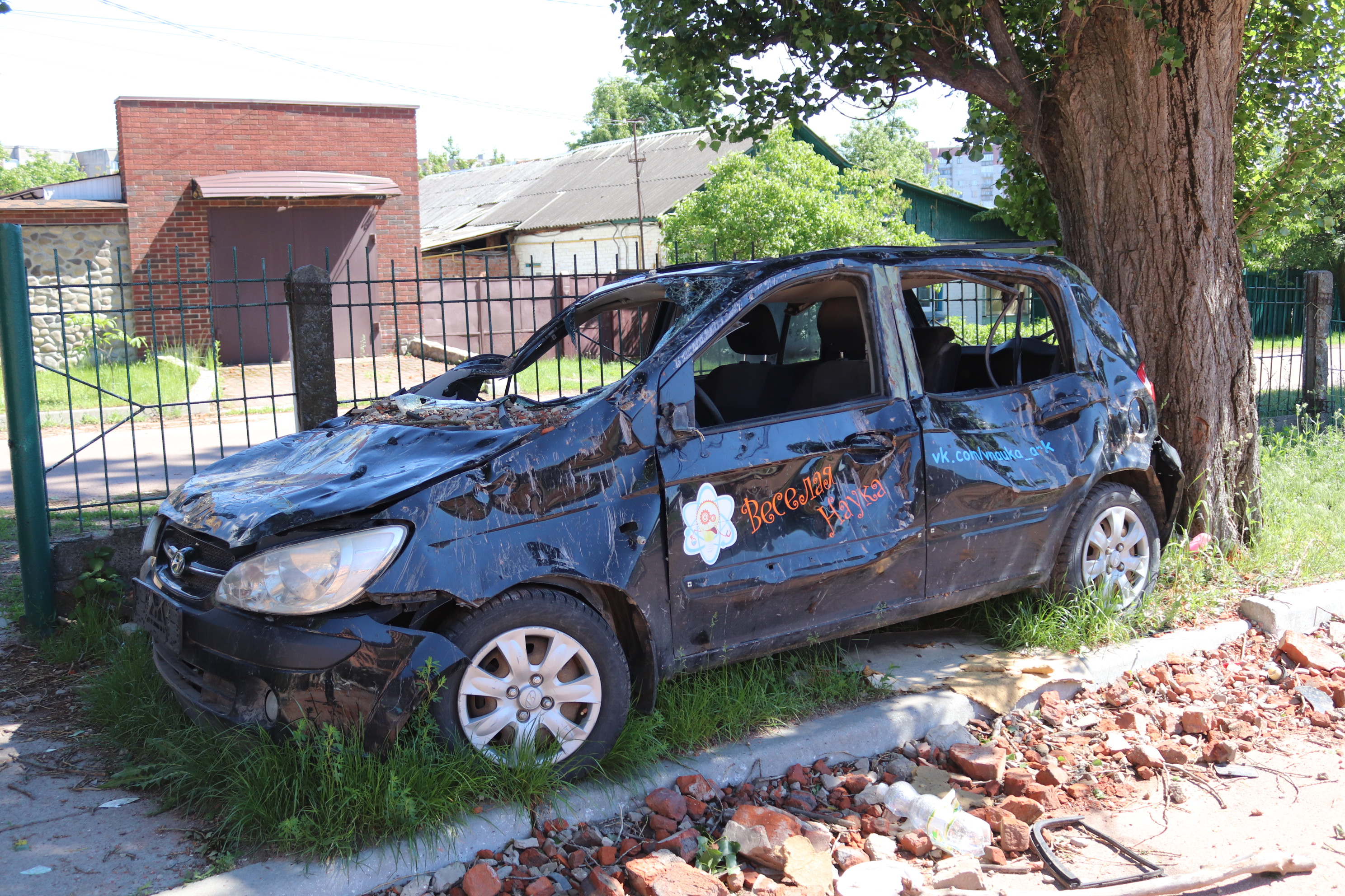 Remnants of a car previously used for educational projects, damaged by particles from a blast near school #21 in Chernihiv.