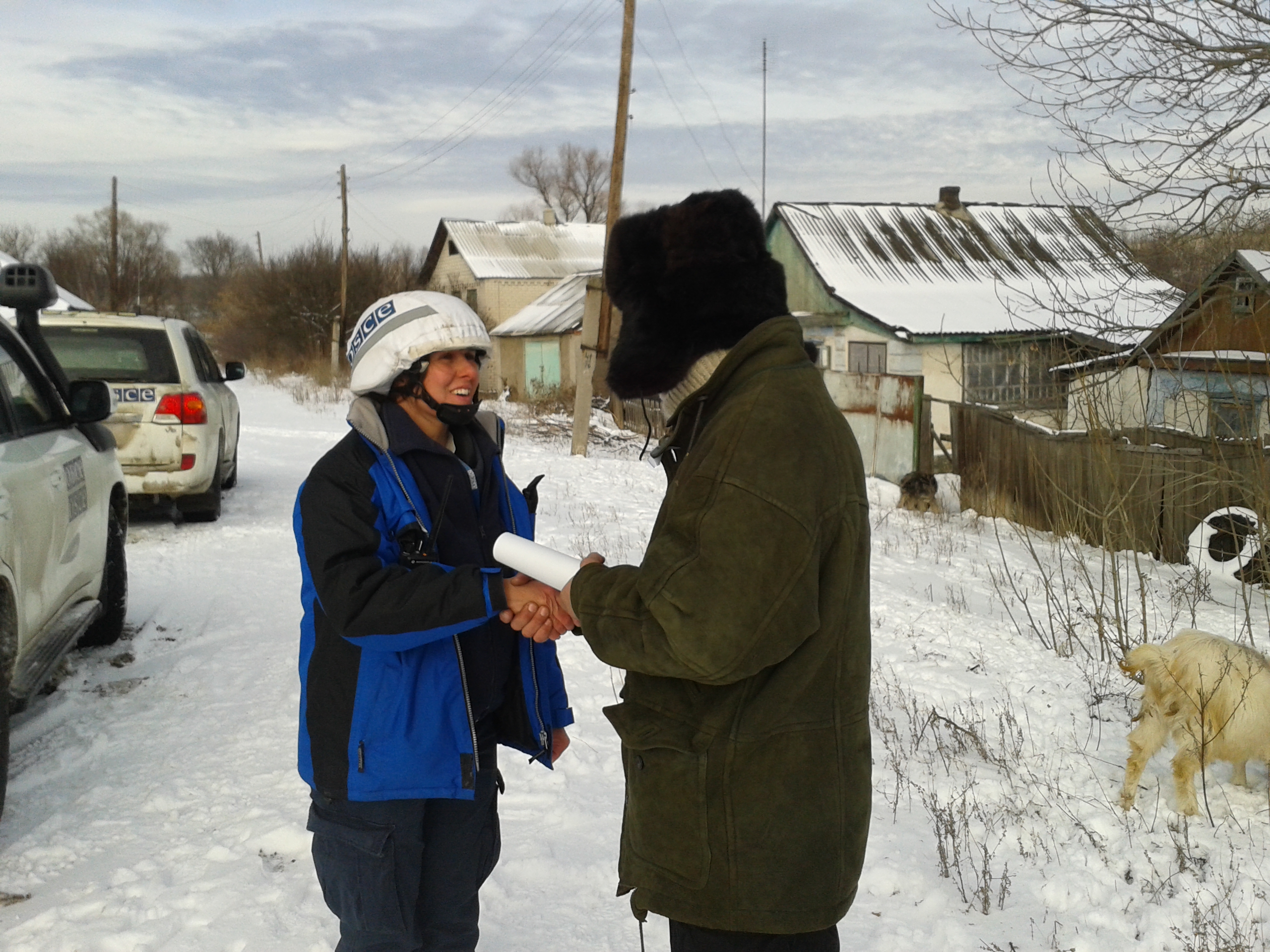 Annie Syrett, a Sievierodonetsk-based monitoring officer, speaks with a man in the non-government controlled areas last autumn during the 16-day End Violence Against Women campaign.