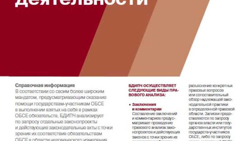 В соответствии со своим более широким мандатом, предусматривающим оказание помощи государствам-участникам ОБСЕ в выполнении взятых на себя в рамках ОБСЕ обязательств, БДИПЧ анализирует по запросу отдельные законопроекты и действующие законодательные акты с точки зрения их соответствия обязательствам ОБСЕ в области человеческого измерения и международным стандартам прав человека. Осуществляя анализ законодательства, БДИПЧ также приводит примеры хорошей практики из других государств-участников ОБСЕ и дает конкретные рекомендации по совершенствованию законодательства. В определенных обстоятельствах БДИПЧ готовит анализ совместно с другими структурами ОБСЕ и международными организациями, в частности с Европейской комиссией за демократию через право (Венецианской комиссией).