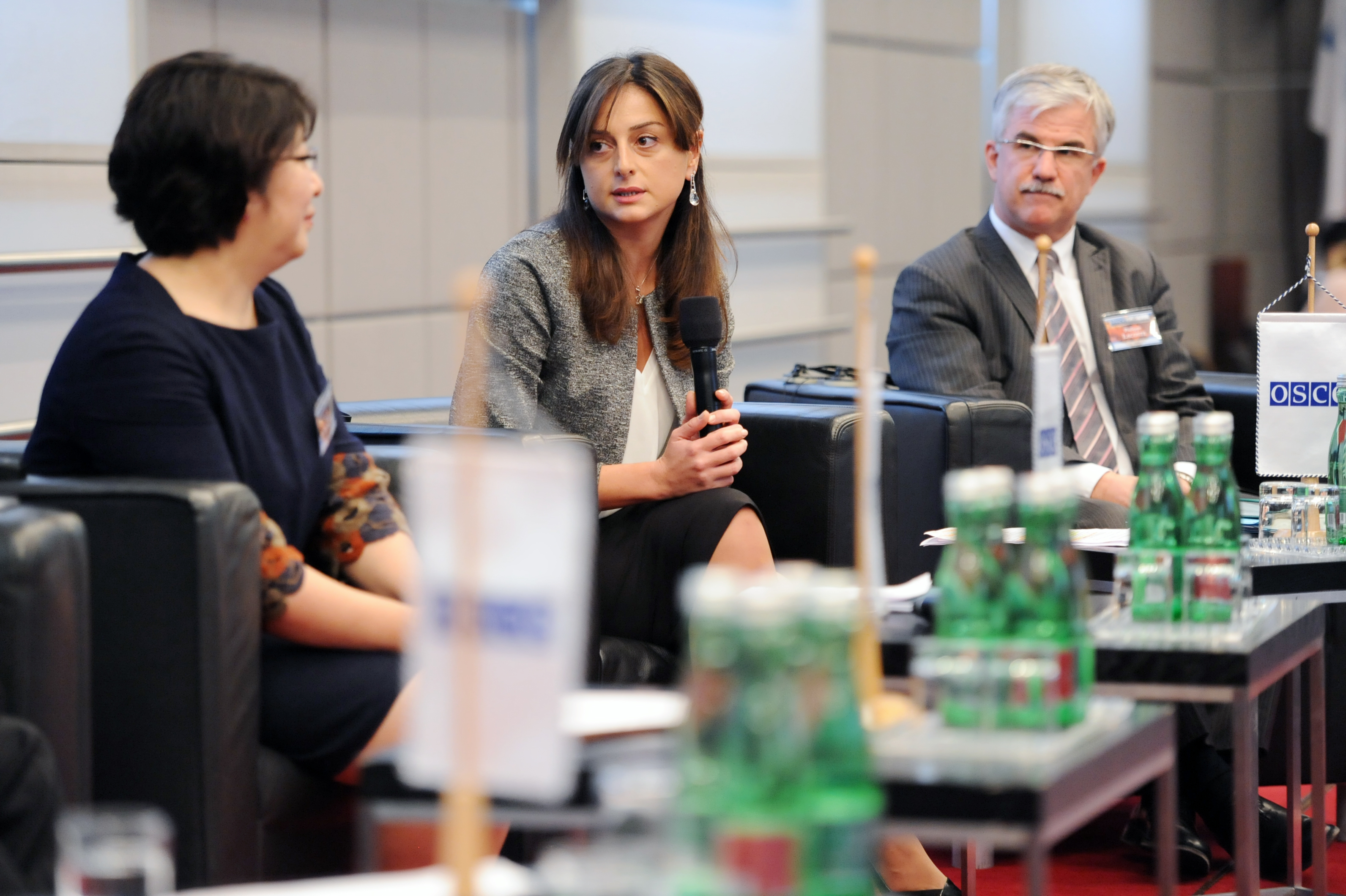(L-r) Dinara Kemelova, First Deputy Foreign Minister of the Kyrgyz Republic, Maia Bitadze, Deputy Minister of Environment and Natural Resources Protection of Georgia, Ambassador Philippe Lacoste, Deputy Special Representative of the French Minister of Foreign Affairs for the 2015 Paris Climate Conference, during a panel session at the OSCE Security Days event on climate change and security, Vienna, 28 October 2015.