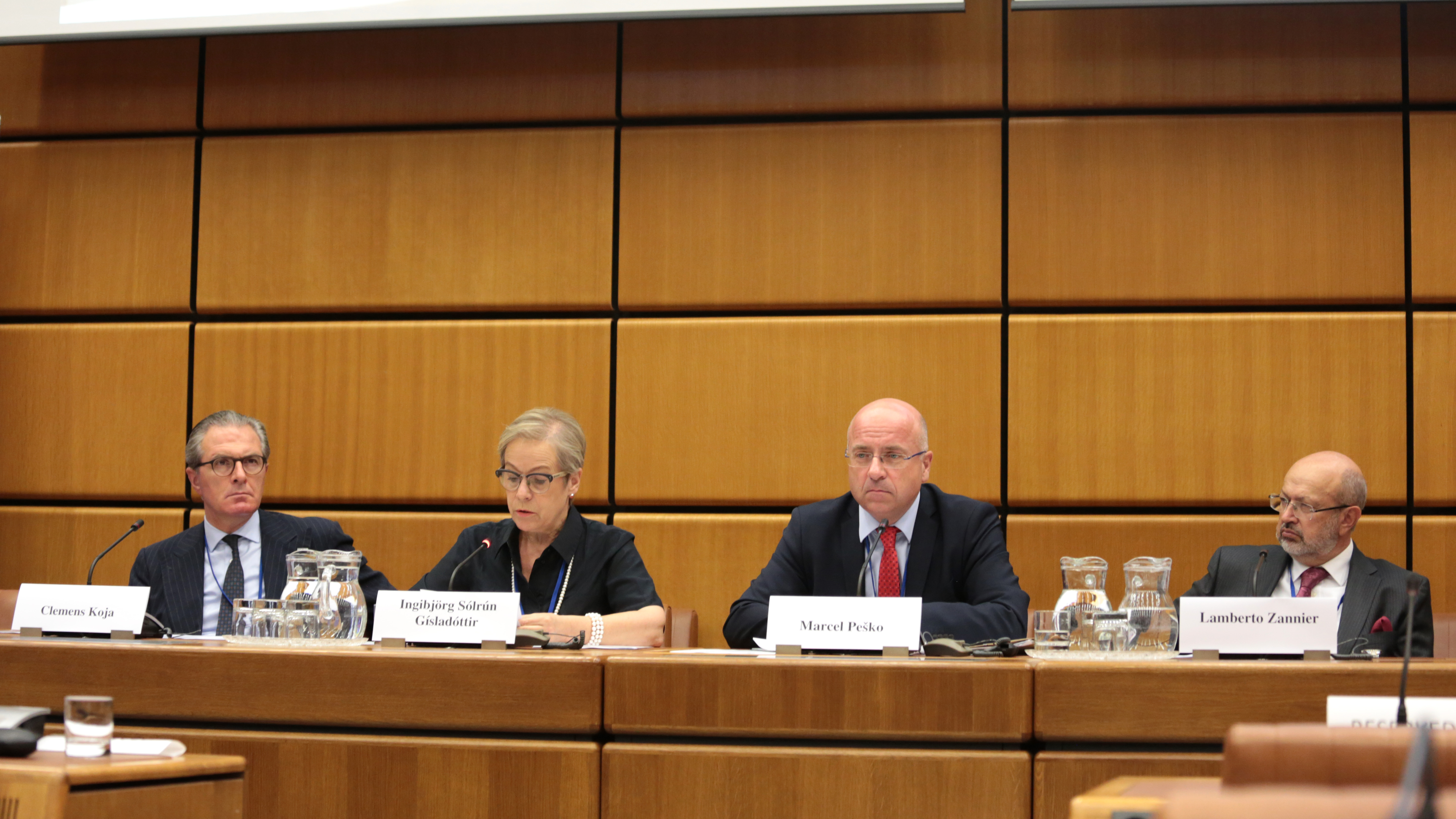 L-r: Clemens Koja, Head of the OSCE Mission to Skopje, Ingibjörg Sólrún Gísladóttir, Director of the OSCE Office for Democratic Institutions and Human Rights, Marcel Pesko, Director of the OSCE Conflict Prevention Centre, Lamberto Zannier, OSCE High Commissioner on National Minorities, at the Security Day “The OSCE and the Sustainable Development Goals”, Vienna, 4 June 2019.
