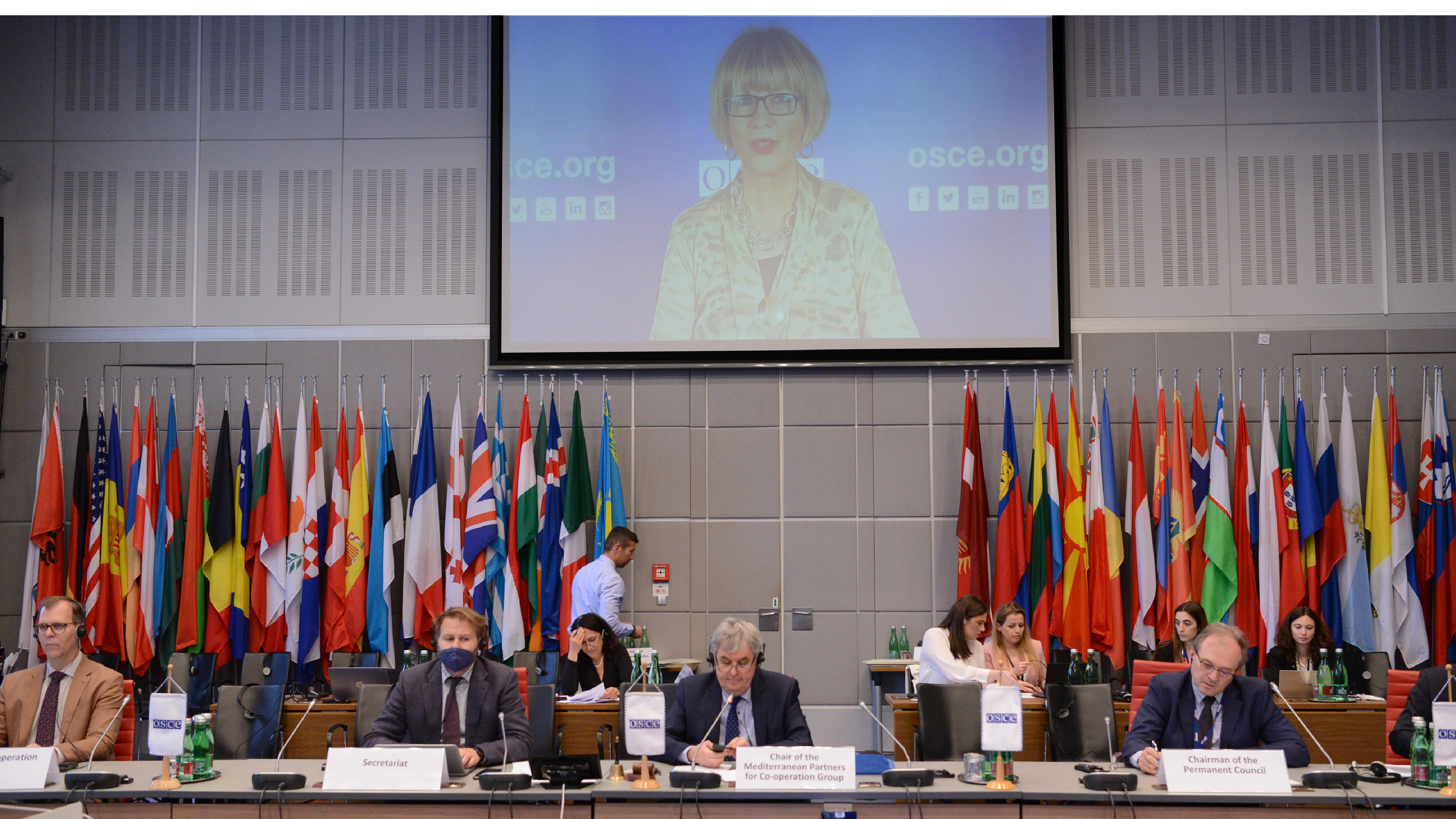 The OSCE Secretary General Helga Maria Schmid speaking at the OSCE Mediterranean Partners Group Meeting, Vienna, 30 May 2022.