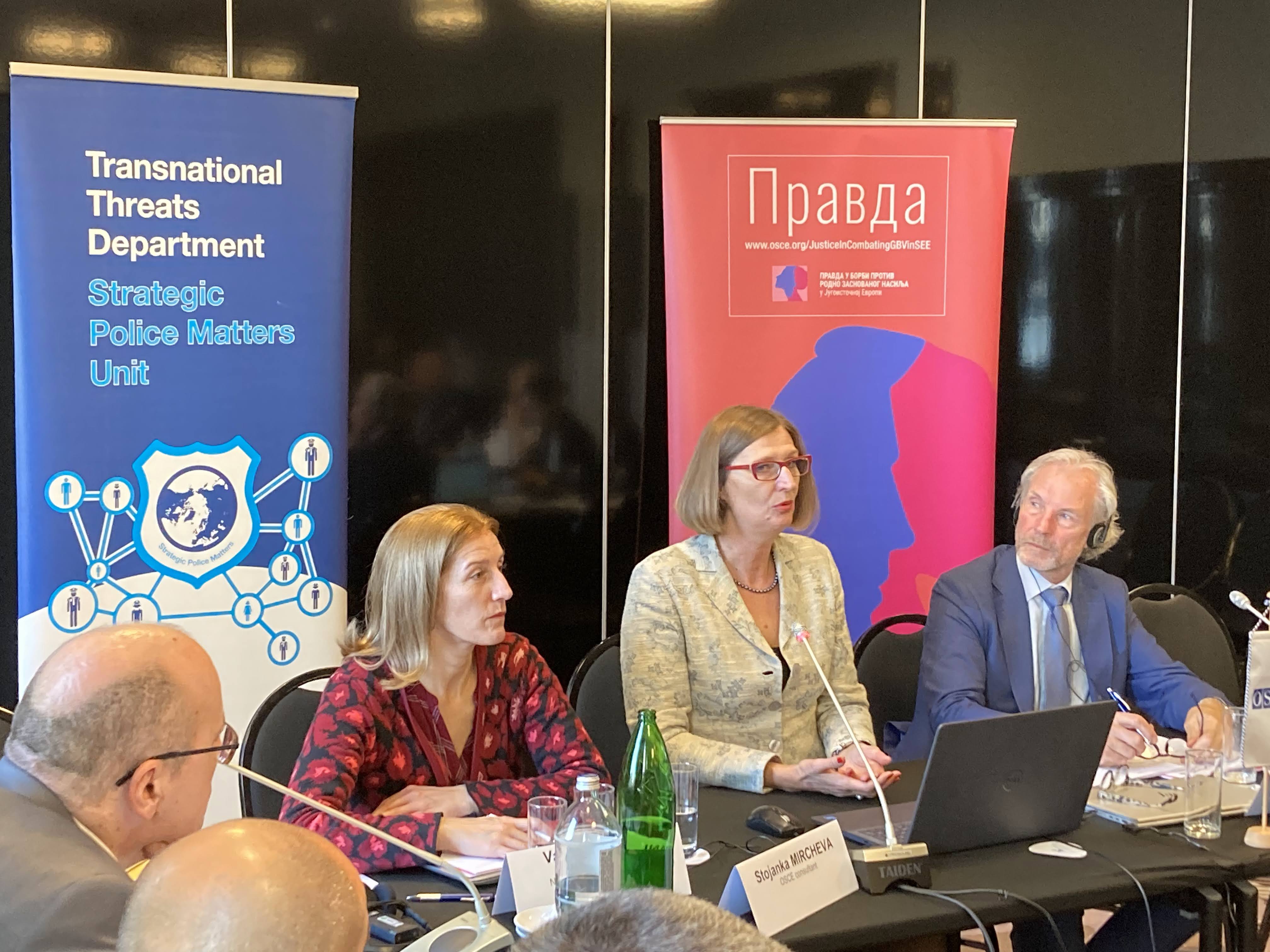 Valdete Osmani (l), National Programme Officer at the OSCE mission to Serbia, Professor Stojanka Mircheva (c) and Bjorn Tore Saltvik (r), Adviser on Police Reform and Project Manager at OSCE Secretariat, speaking at the gender-based violence workshop, Belgrade, 10 November 2022.
