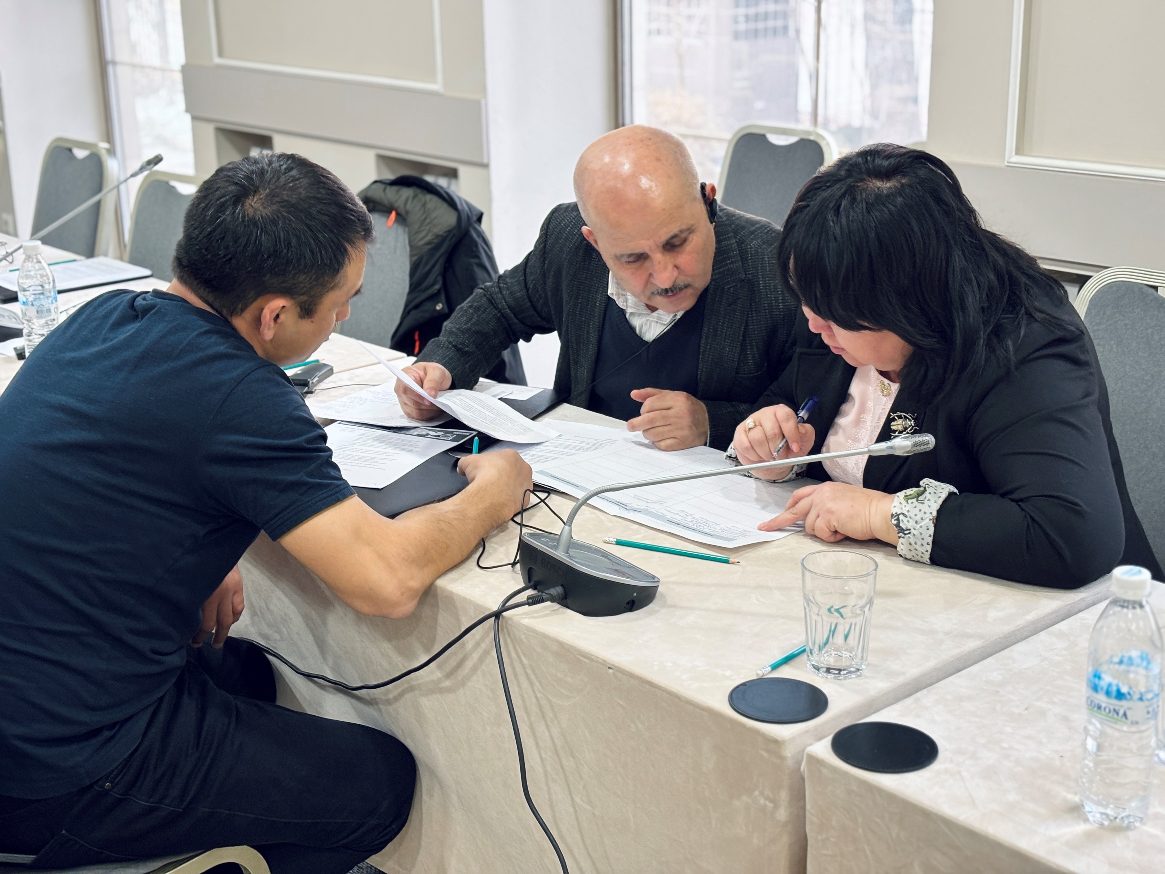 Workshop participants discuss in groups a competencies matrix on investigating cybercrimes and handling electronic evidence for different criminal justice roles in Kyrgyzstan, Bishkek, 27 February 2025.