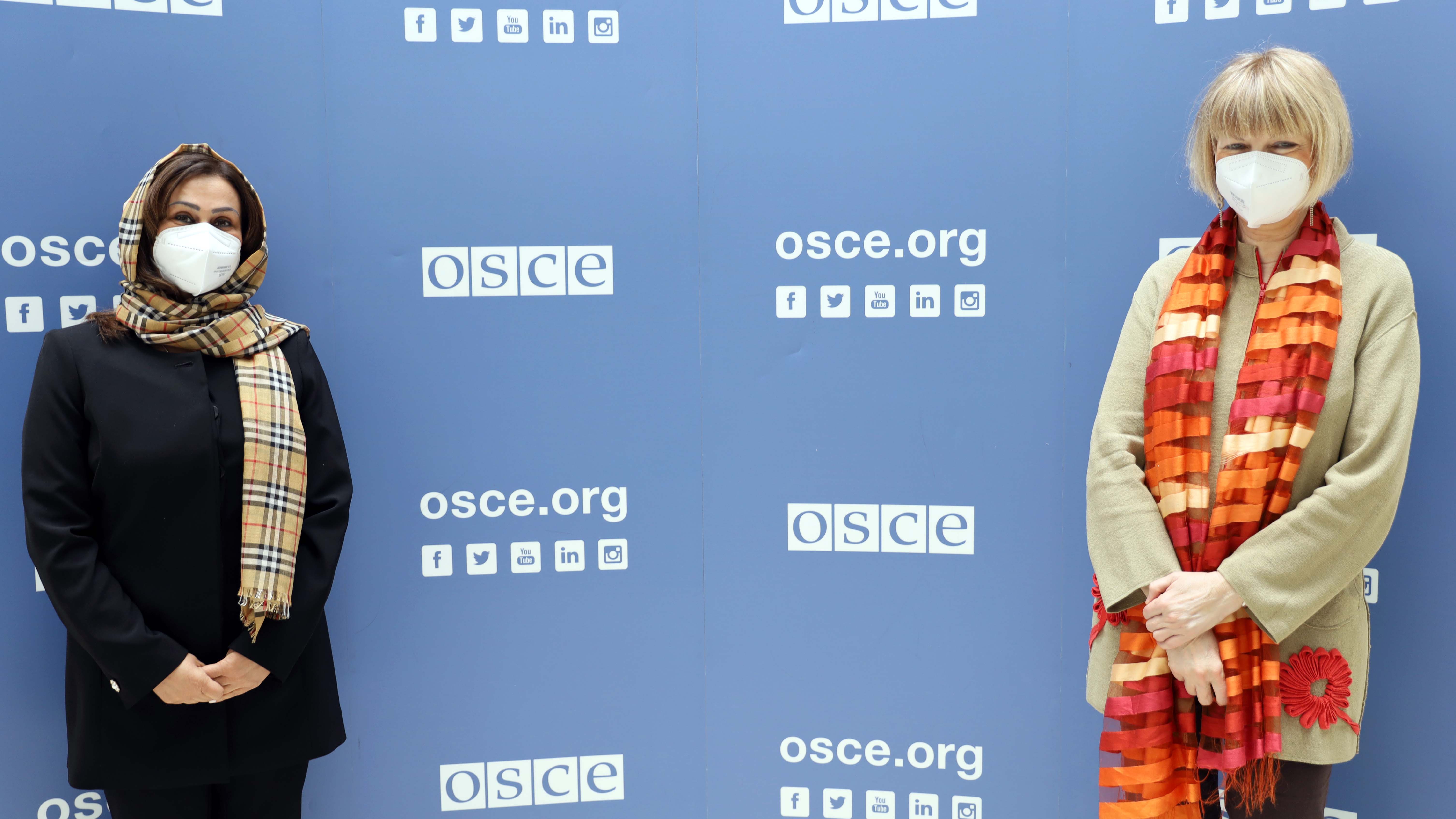 H.E. Manizha Bakhtari (l), Ambassador of the Islamic Republic of Afghanistan, OSCE Partner for Co-operation with OSCE Secretary General Helga Maria Schmid, Vienna, 19 February 2021.
