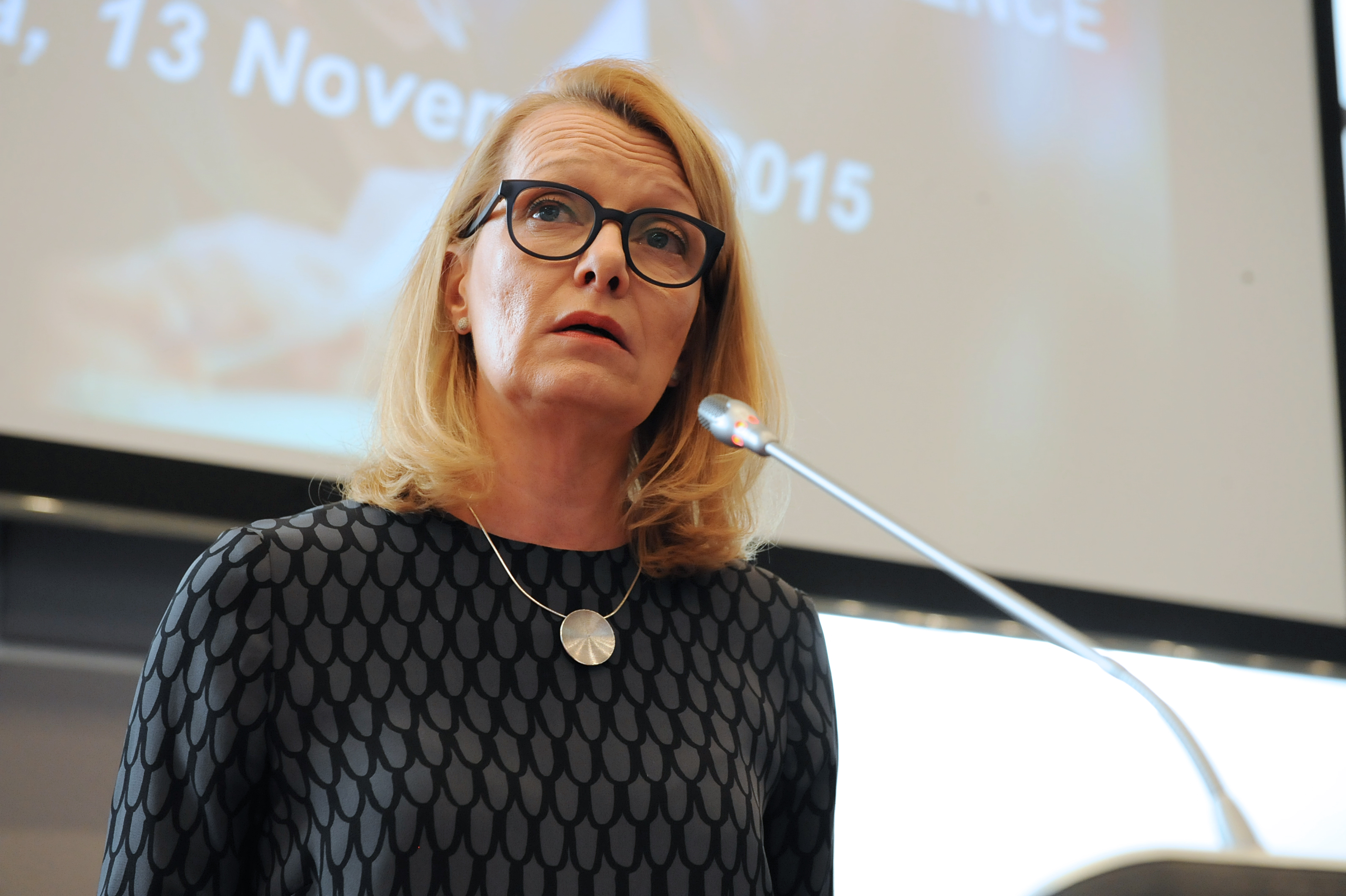 H.E. Lenita Toivakka, Minister for Foreign Trade and Development, Finland, delivering the keynote speech at the OSCE Security Days event on gender equality and security, Vienna, 13 November 2015.