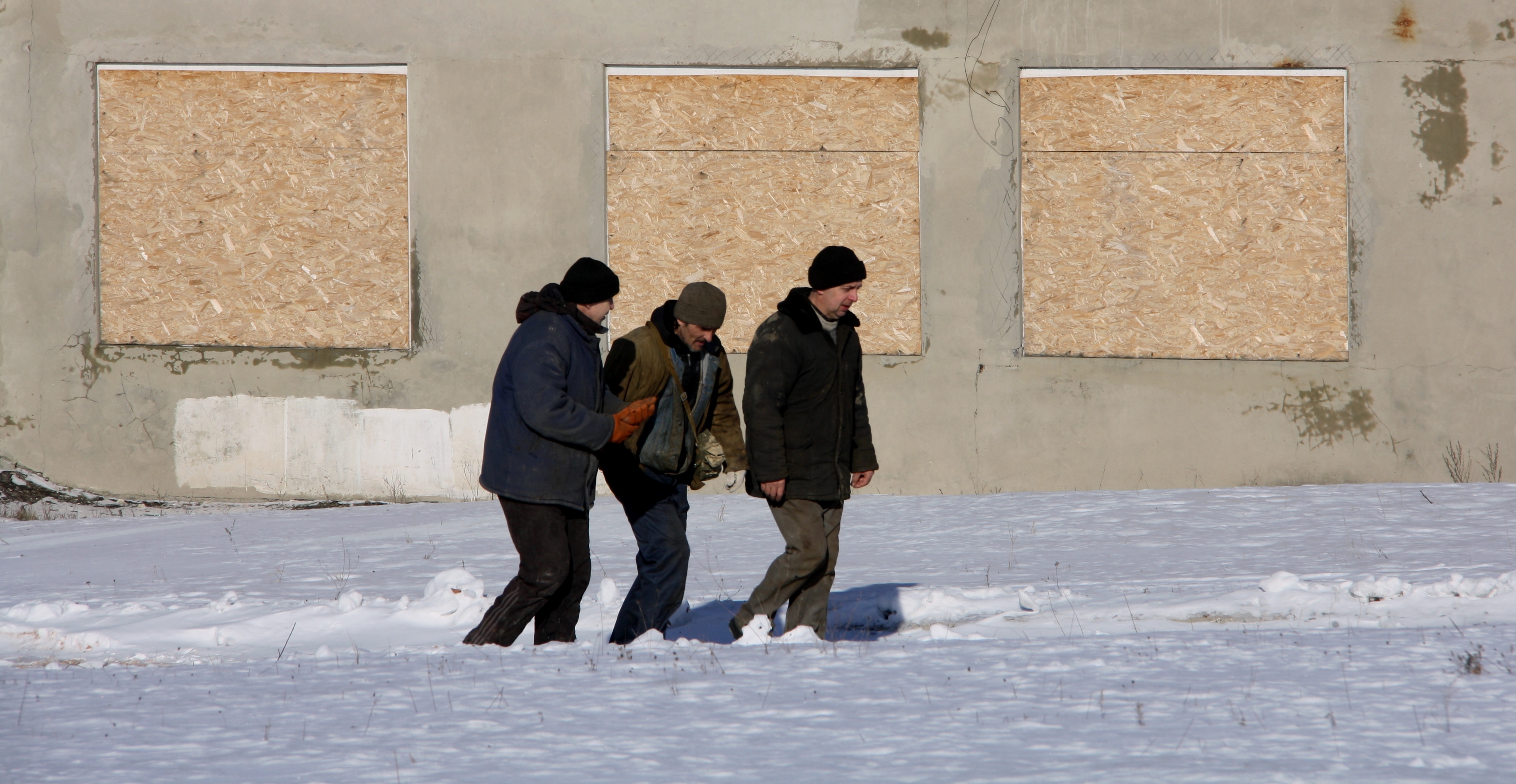 Workers at the Donetsk water filtration station walk past the boarded up windows of one of the plant’s buildings. The workers are among the unsung heroes of the conflict, risking their lives in daily commutes past armed fortifications into the grey zone, Donetsk, Ukraine, 8 February 2017.