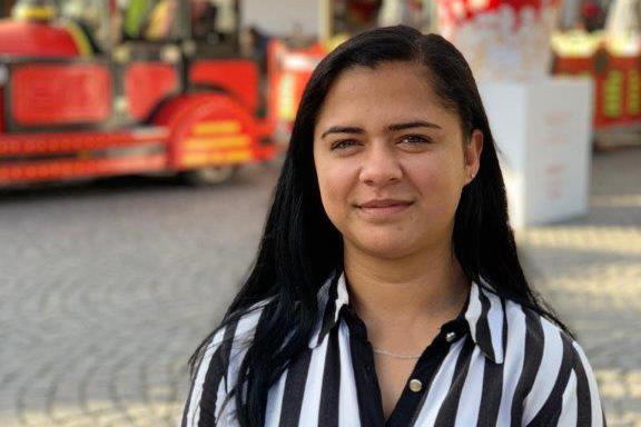 Mergita Hoti, 22 vjeçare nga Gjakova, na mirëpriti në zyrat me plot ngjyra të organizatës joqeveritare Roma in Action.