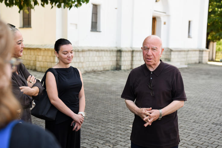 Don Lush Gjergji ndan me studentët historinë e rëndësishme të kishës. 19 Gusht 2025 (OSCE/Leurina Mehmeti).